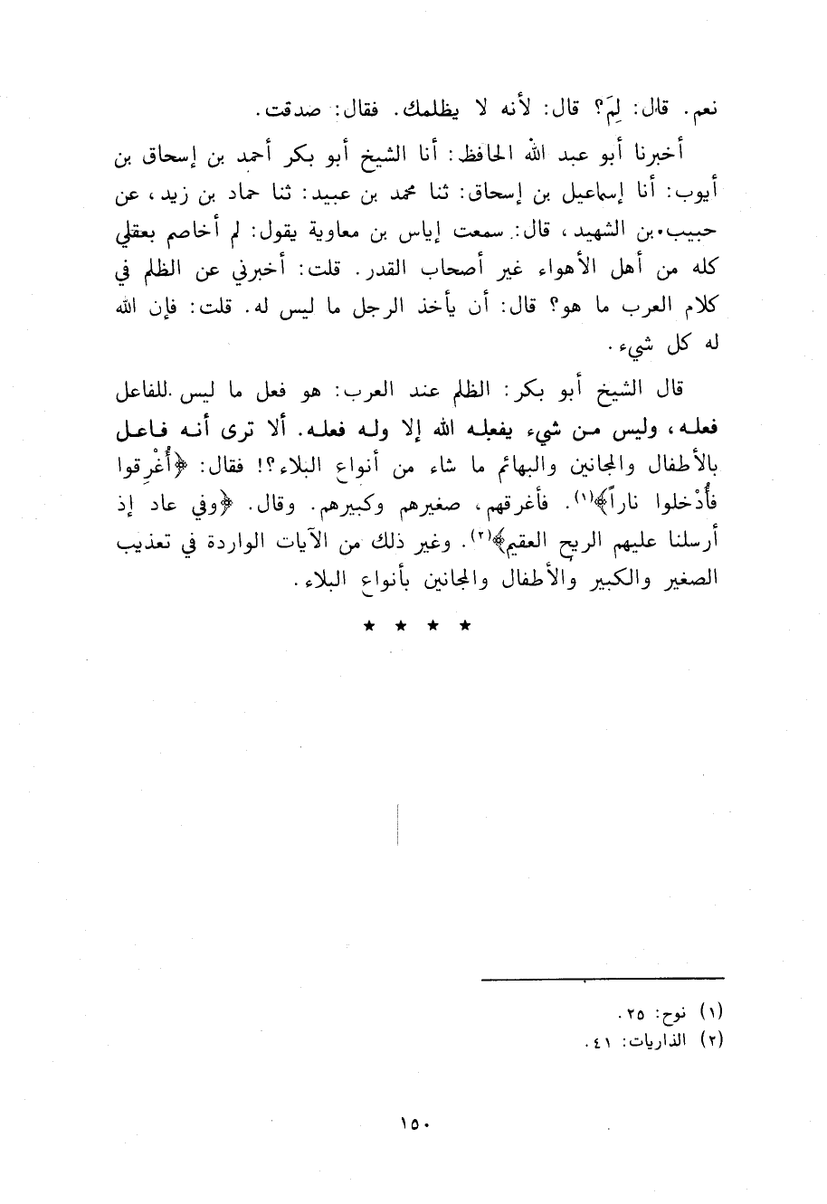 أَخْبَرَنَا أَبُو عَبْدِ اللَّهِ الْحَافِظُ، أنا الشَّيْخُ أَبُو بَكْرٍ أَحْمَدُ بْنُ إِسْحَاقَ بْنِ أَيُّوبَ، أنا إِسْمَاعِيلُ بْنُ إِسْحَاقَ، ثنا مُحَمَّدُ بْنُ عُبَيْدٍ، ثنا حَمَّادُ بْنُ زَيْدٍ، عَنْ حَبِيبِ بْنِ الشَّهِيدِ، قَالَ: سَمِعْتُ إِيَاسَ بْنَ مُعَاوِيَةَ، يَقُولُ: لَمْ أُخَاصِمْ بِعَقْلِي كُلِّهِ مِنْ أَهْلِ الْأَهْوَاءِ غَيْرَ أَصْحَابِ الْقَدَرِ، قُلُتْ أَخْبِرْنِي عَنِ §الظُّلْمِ فِي كَلَامِ الْعَرَبِ مَا هُوَ؟ قَالَ: أَنْ يَأَخُذَ الرَّجُلُ مَا لَيْسَ لَهُ، قُلْتُ: فَإِنَّ اللَّهَ لَهُ كُلُّ شَيْءٍ قَالَ الشَّيْخُ أَبُو بَكْرٍ: الظُّلْمُ عِنْدَ الْعَرَبِ هُوَ فِعْلُ مَا لَيْسَ لِلْفَاعِلِ فِعْلُهُ وَلَيْسَ مِنْ شَيْءٍ يَفْعَلُهُ اللَّهُ إِلَّا وَلَهُ فِعْلُهُ، أَلَا تَرَى أَنَّهُ فَاعِلٌ بِالْأَطْفَالِ وَالْمَجَانِينَ وَالْبَهَائِمِ مَا شَاءَ مِنْ أَنْوَاعِ الْبَلَاءِ، فَقَالَ: {أُغْرِقُوا فَأُدْخِلُوا نَارًا} [نوح: 25] فَأَغْرَقَهُمْ صَغِيرَهُمْ وَكَبِيرَهُمْ، وَقَالَ: {وَفِي عَادٍ إِذْ أَرْسَلْنَا عَلَيْهِمُ الرِّيحَ الْعَقِيمَ} [الذاريات: 41] وَغَيْرَ ذَلِكَ مِنَ الْآيَاتِ الْوَارِدَةِ فِي تَعْذِيبِ الصَّغِيرِ وَالْكَبِيرِ وَالْأَطْفَالِ وَالْمَجَانِينَ بِأَنْوَاعِ الْبَلَاءِ