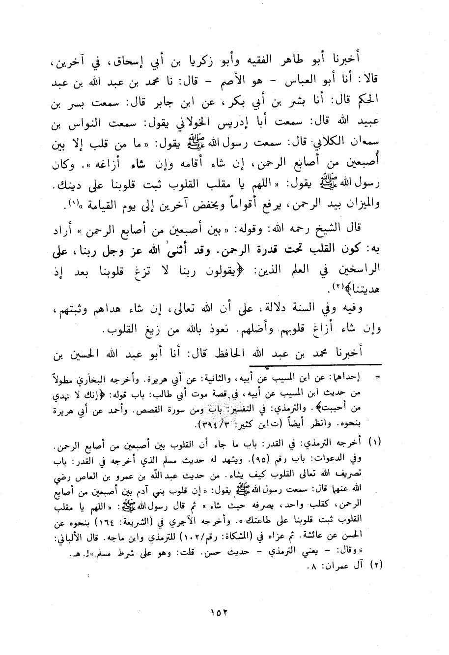 أَخْبَرَنَا أَبُو طَاهِرٍ الْفَقِيهُ، وَأَبُو زَكَرِيَّا بْنُ أَبِي إِسْحَاقَ فِي آخَرِينَ قَالَا، أنا أَبُو الْعَبَّاسِ هُوَ الْأَصَمُّ قَالَ: نا مُحَمَّدُ بْنُ عَبْدِ اللَّهِ بْنِ عَبْدِ الْحَكَمِ، قَالَ، نا بِشْرُ بْنُ أَبِي بَكْرٍ، عَنِ ابْنِ جَابِرٍ، قَالَ: سَمِعْتُ بُسْرَ بْنَ عُبَيْدِ اللَّهِ، قَال: سَمِعْتُ أَبَا إِدْرِيسَ الْخَوْلَانِيَّ، يَقُولُ: سَمِعْتُ النَّوَّاسَ بْنَ سَمْعَانَ الْكِلَابِيَّ، قَالَ: سَمِعْتُ رَسُولَ اللَّهِ صَلَّى اللهُ عَلَيْهِ وَسَلَّمَ يَقُولُ: §" مَا مِنْ قَلْبٍ إِلَّا بَيْنَ أُصْبُعَيْنِ مِنْ أَصَابِعِ الرَّحْمَنِ إِنْ شَاءَ أَقَامَهُ، وَإِنْ شَاءَ أَزَاغَهُ، وَكَانَ رَسُولُ اللَّهِ صَلَّى اللهُ عَلَيْهِ وَسَلَّمَ يَقُولُ: «اللَّهُمَّ يَا مُقَلِّبَ الْقُلُوبِ ثَبِّتْ قُلُوبَنَا عَلَى دِينِكَ، وَالْمِيزَانُ بِيَدِ الرَّحْمَنِ يَرْفَعُ أَقْوَامًا وَيَخْفِضُ آخَرِينَ إِلَى يَوْمِ الْقِيَامَةِ» قَالَ الشَّيْخُ رَحِمَهُ اللَّهُ: وَقَوْلُهُ «بَيْنَ أُصْبُعَيْنِ مِنْ أَصَابِعِ الرَّحْمَنِ» أَرَادَ بِهِ كَوْنَ الْقَلْبِ تَحْتَ قُدْرَةِ الرَّحْمَنِ وَقَدْ أَثْنَى اللَّهُ عَزَّ وَجَلَّ ربُّنَا عَلَى الرَّاسِخِينَ فِي الْعِلْمِ الَّذِينَ يَقُولُونَ {رَبَّنَا لَا تُزِغْ قُلُوبَنَا بَعْدَ إِذْ هَدَيْتَنَا} [آل عمران: 8] وَفِيهِ وَفِي السُّنَّةِ دَلَالَةٌ عَلَى أَنَّ اللَّهَ تَعَالَى إِنْ شَاءَ هَدَاهُمْ وَثَبَّتَهُمْ وَإِنْ شَاءَ أَزَاغَ قُلُوبَهُمْ وَأَضَلَّهُمْ نَعُوذُ بِاللَّهِ مِنْ زَيْغِ الْقُلُوبِ