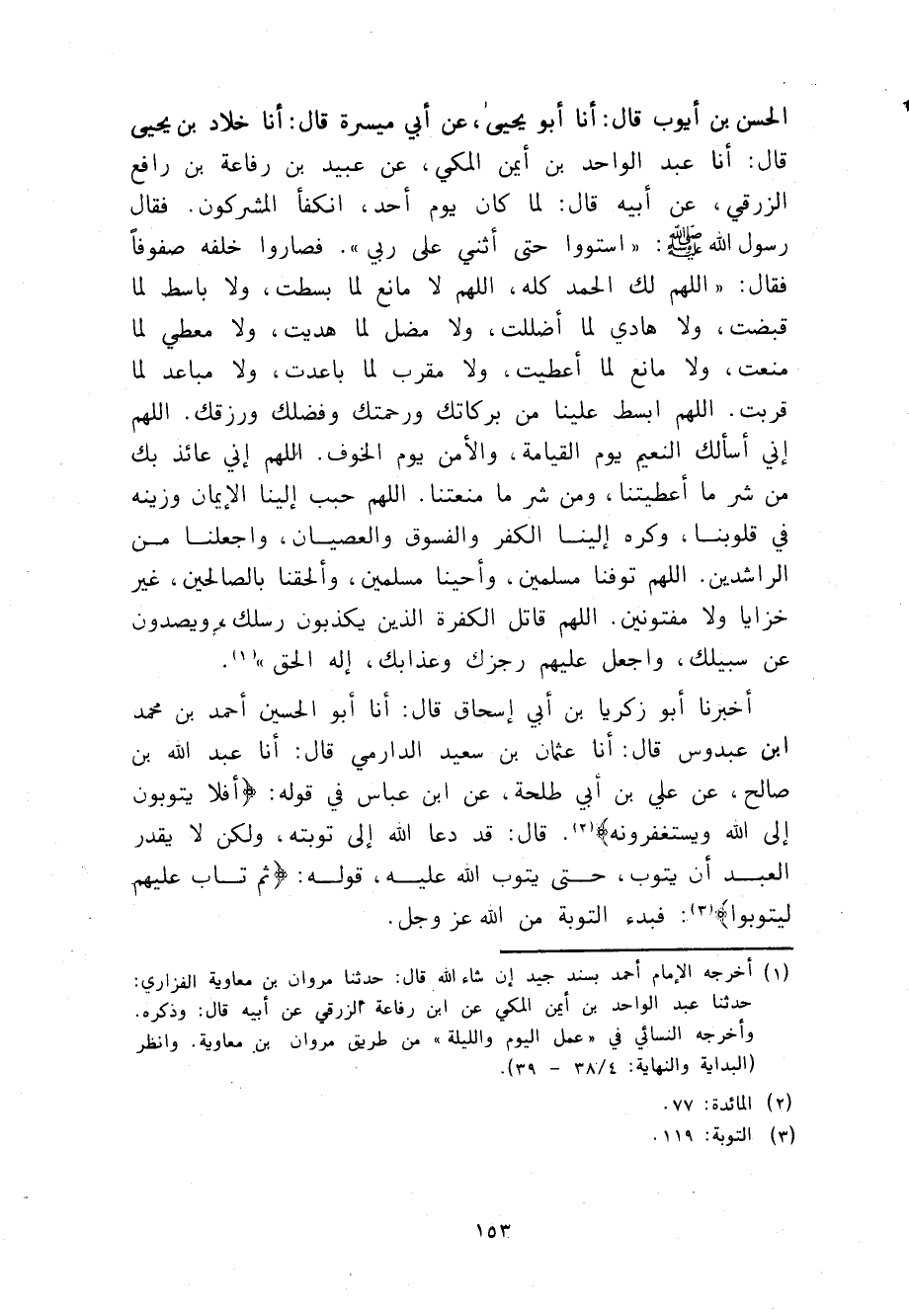 أَخْبَرَنَا أَبُو زَكَرِيَّا بْنُ أَبِي إِسْحَاقَ قَالَ، أنا أَبُو الْحُسَيْنِ أَحْمَدُ بْنُ مُحَمَّدِ بْنِ عَبْدُوسٍ قَالَ، نا عُثْمَانُ بْنُ سَعِيدٍ الدَّارِمِيُّ قَالَ، نا عَبْدُ اللَّهِ بْنُ صَالِحٍ، عَنْ عَلِيِّ بْنِ أَبِي طَلْحَةَ، عَنِ ابْنِ عَبَّاسٍ فِي قَوْلِهِ {§أَفَلَا يَتُوبُونَ إِلَى اللَّهِ وَيَسْتَغْفِرُونَهُ} [المائدة: 74] قَالَ: قَدْ دَعَا اللَّهُ إِلَى تَوْبَتِهِ وَلَكِنْ لَا يَقْدِرُ الْعَبْدُ أَنْ يَتُوبَ حَتَّى يَتُوبَ اللَّهُ عَلَيْهِ، قوْلُهُ {ثُمَّ تَابَ عَلَيْهِمْ لِيَتُوبُوا} [التوبة: 118] فَبَدْءُ التَّوْبَةِ مِنَ اللَّهِ عَزَّ وَجَلَّ