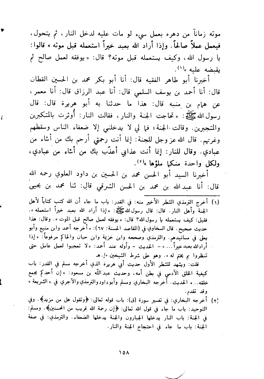أَخْبَرَنَا أَبُو طَاهِرٍ الْفَقِيهُ، قَالَ، أنا أَبُو بَكْرٍ مُحَمَّدُ بْنُ الْحُسَيْنِ الْقَطَّانُ قَالَ: نا أَحْمَدُ بْنُ يُوسُفَ السُّلَمِيُّ، قَالَ، نا عَبْدُ الرَّزَّاقُ، قَالَ، أنا مَعْمَرٌ، عَنْ هَمَّامِ بْنِ مُنَبِّهٍ، قَالَ: هَذَا مَا حَدَّثَنَا بِهِ أَبُو هُرَيْرَةَ، قَالَ: قَالَ رَسُولُ اللَّهِ صَلَّى اللهُ عَلَيْهِ وَسَلَّمَ: " §تَحَاجَّتِ الْجَنَّةُ وَالنَّارُ، فَقَالَتِ النَّارُ: أُوثِرْتُ بِالْمُتَكَبِّرِينَ وَالْمُتَجَبِّرِينَ، وَقَالَتِ الْجَنَّةُ: فَمَالِي لَا يَدْخُلُنِي إِلَّا ضُعَفَاءُ النَّاسِ وَسَقَطُهُمْ وَغُرَّتُهُمْ؟ قَالَ اللَّهُ عَزَّ وَجَلَّ لِلْجَنَّةِ: إِنَّمَا أَنْتِ رَحْمَتِي أَرْحَمُ بِكَ مَنْ أَشَاءُ مِنْ عِبَادِي، وَقَالَ لِلنَّارِ: إِنَّمَا أَنْتِ عَذَابِي أُعذِّبُ بِكِ مَنْ أَشَاءُ مِنْ عِبَادِي، وَلِكُلِّ وَاحِدَةٍ مِنْكُمَا مِلْؤُهَا "