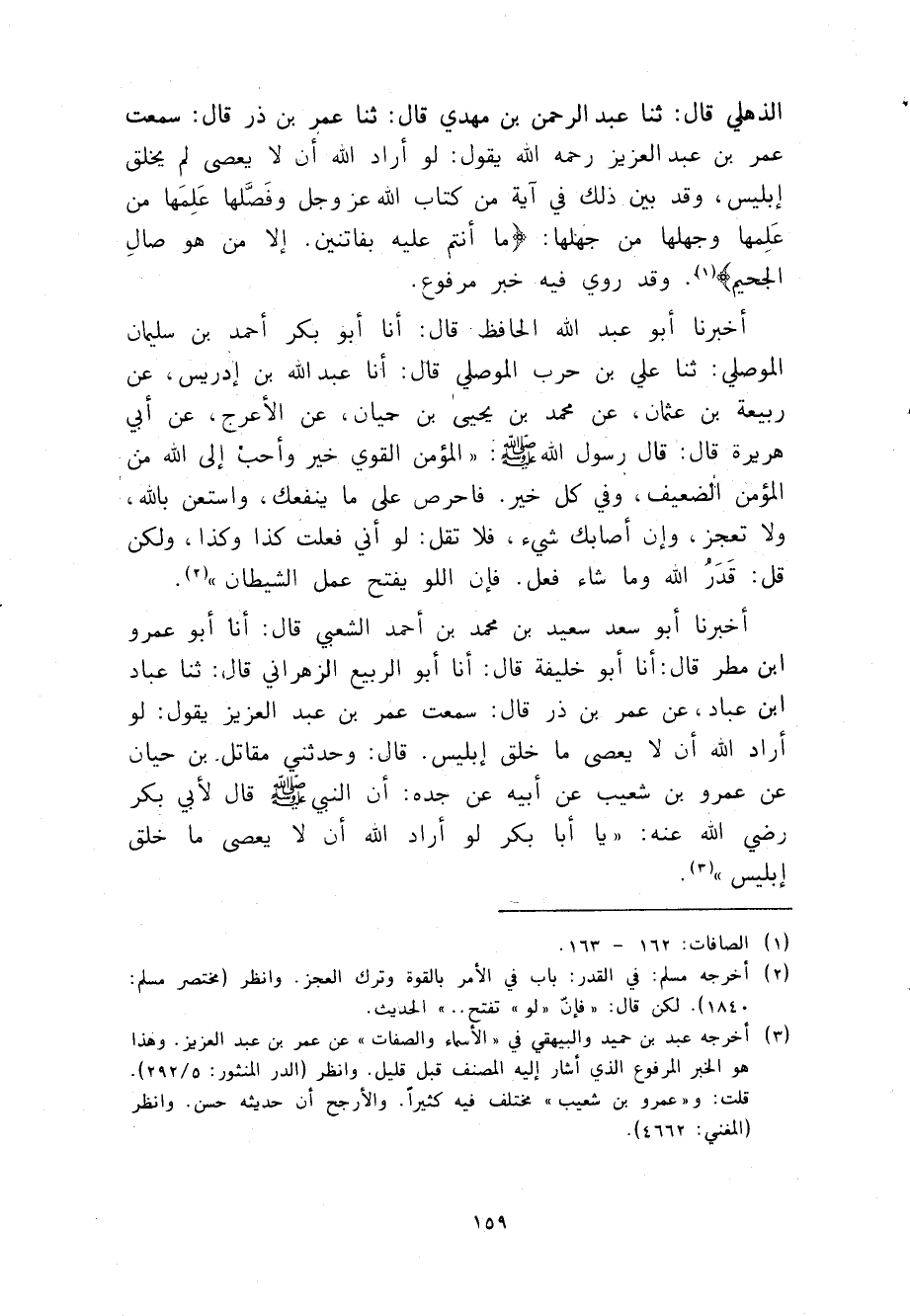 أَخْبَرَنَا أَبُو سَعْدٍ سَعِيدُ بْنُ مُحَمَّدِ بْنِ أَحْمَدَ الشَّعْبِيُّ قَالَ، أنا أَبُو عَمْرِو بْنُ مَطَرٍ، قَالَ، أنا أَبُو خَلِيفَةَ، قَالَ، نا أَبُو الرَّبِيعِ الزَّهْرَانِيُّ، قَالَ، ثنا عَبَّادُ بْنُ عَبَّادٍ، عَنْ عُمَرَ بْنِ ذَرٍّ، قَالَ: سَمِعْتُ عُمَرَ بْنَ عَبْدِ الْعَزِيزِ، يَقُولُ: §لَوْ أَرَادَ اللَّهُ أَنْ لَا يُعْصَى مَا خَلَقَ إِبْلِيسَ