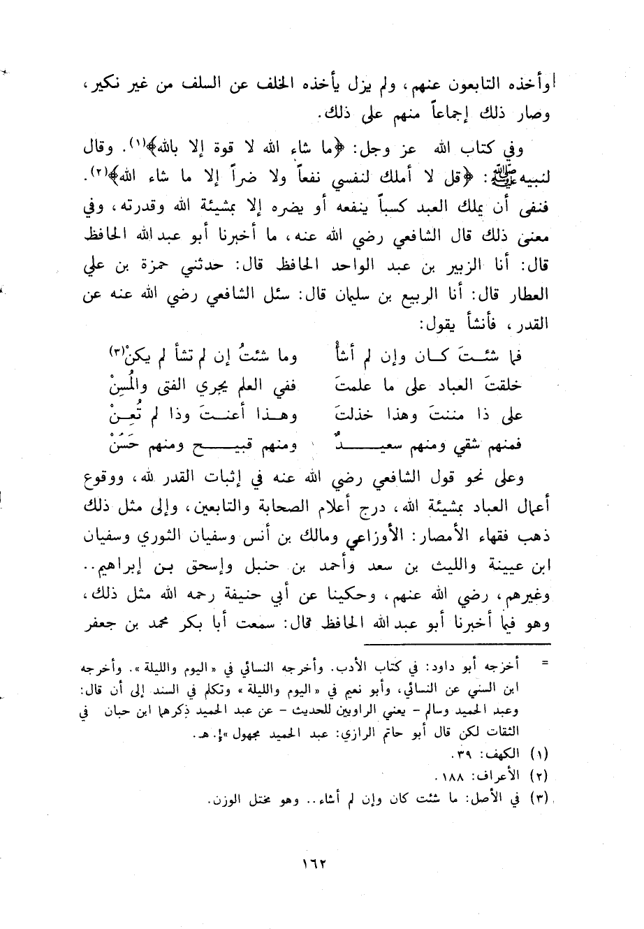 وَعَلَى نَحْوِ قَوْلِ الشَّافِعِيِّ رَضِيَ اللَّهُ عَنْهُ فِي إِثْبَاتِ الْقَدَرِ لِلَّهِ، وَوُقُوعِ أَعْمَالِ الْعِبَادِ بِمَشِيئَةِ اللَّهِ دَرَجَ أَعْلَامُ الصَّحَابَةِ وَالتَّابِعِينَ وَإِلَى مِثْلِ ذَلِكَ ذَهَبَ فُقَهَاءُ الْأَمْصَارِ: الْأَوْزَاعِيُّ، وَمَالِكُ بْنُ أَنَسٍ، وَسُفْيَانُ الثَّوْرِيُّ، وَسُفْيَانُ بْنُ عُيَيْنَةَ، وَاللَّيْثُ بْنُ سَعْدٍ، وَأَحْمَدُ بْنُ حَنْبَلٍ، وَإِسْحَاقُ بْنُ إِبْرَاهِيمَ وَغَيْرُهُمْ رَضِيَ اللَّهُ عَنْهُمْ، وَحَكَيْنَا عَنْ أَبِي حَنِيفَةَ رَحِمَهُ اللَّهُ مِثْلَ ذَلِكَ وَهُوَ فِيمَا