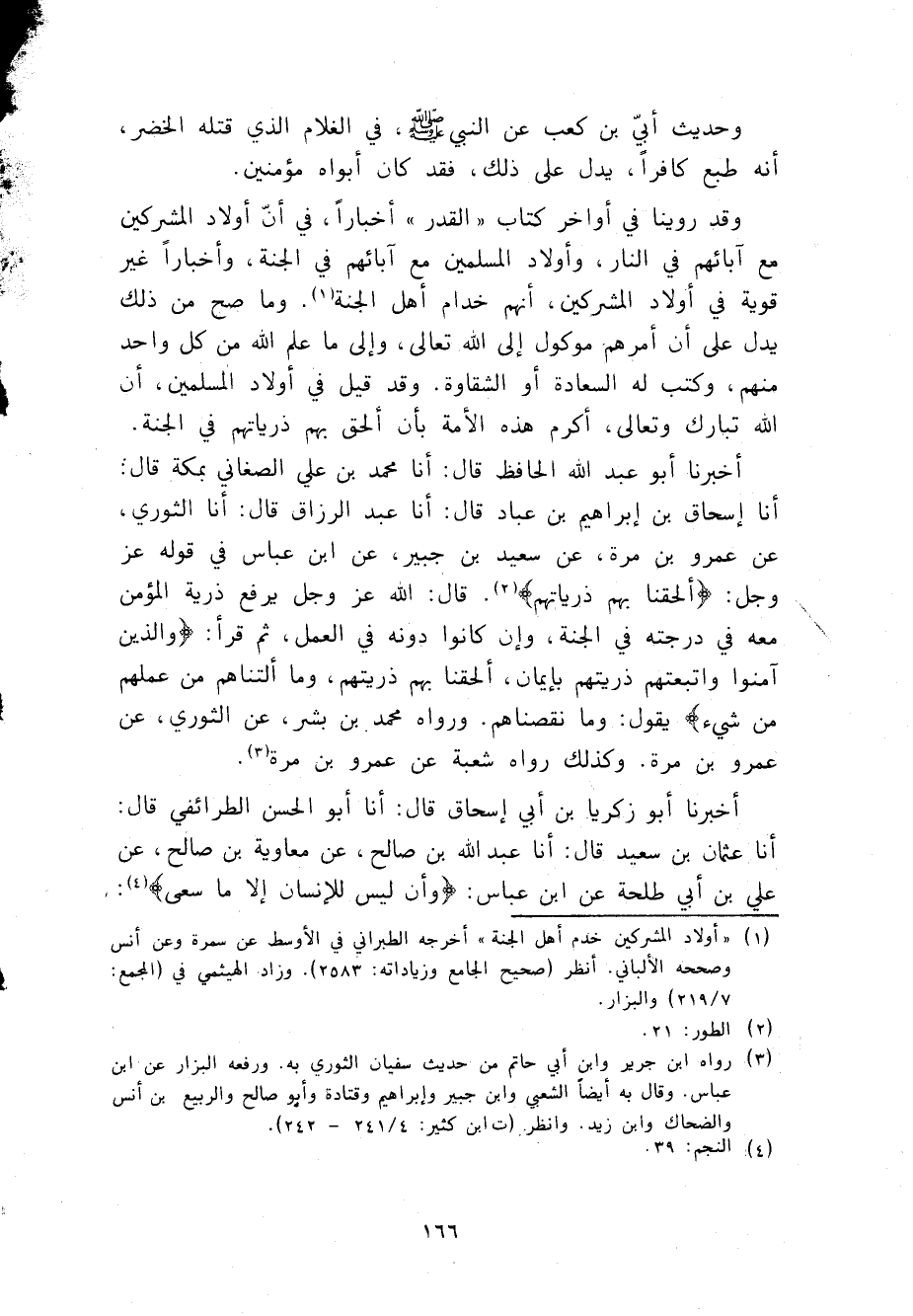 أَخْبَرَنَا أَبُو زَكَرِيَّا بْنُ أَبِي إِسْحَاقَ قَالَ، أنا أَبُو الْحَسَنِ الطَّرَائِفِيُّ قَالَ، نا عُثْمَانُ بْنُ سَعِيدٍ قَالَ، نا عَبْدُ اللَّهِ بْنُ صَالِحٍ، عَنْ مُعَاوِيَةَ بْنِ صَالِحٍ، عَنْ عَلِيِّ بْنِ أَبِي طَلْحَةَ، عَنِ ابْنِ عَبَّاسٍ وَأَنْ لَيْسَ لِلْإِنْسَانِ إِلَّا مَا سَعَى -[167]- فَأَنْزَلَ اللَّهُ تَعَالَى بَعْدَ هَذَا: (أَلْحَقْنَا بِهِمْ ذُرِّيَّاتِهِمْ) يَعْنِي: بِإِيمَانٍ §فَأَدْخَلَ اللَّهُ عَزَّ وَجَلَّ الْأَبْنَاءَ بِصَلَاحِ الْآبَاءِ الْجَنَّةَ " قَالَ الشَّيْخُ رَحِمَهُ اللَّهُ: فَيُحْتَمَلُ أَنْ يَكُونَ خَبَرُ عَائِشَةَ رَضِيَ اللَّهُ عَنْهَا فِي وَلَدِ الْأَنْصَارِيِّ قَبْلَ نُزُولِ الْآيَةِ، فَجَرَى رَسُولُ اللَّهِ صَلَّى اللهُ عَلَيْهِ وَسَلَّمَ عَلَى الْأَصْلِ الْمَعْلُومِ فِي جَرَيَانِ الْقَلَمِ بِسَعَادَةِ كُلِّ نَسَمَةٍ أَوْ شَقَاوَتِهَا فَمَنَعَ مِنَ الْقَطْعِ بِكَوْنِهِ فِي الْجَنَّةِ، ثُمَّ أَكْرَمَ اللَّهُ تَعَالَى أُمَّتَهُ بِإِلْحَاقِ ذُرِّيَّةِ الْمُؤْمِنِ بِهِ وَإِنْ لَمْ يَعْمَلُوا عَمَلَهُ، فَجَاءَتْ أَخْبَارٌ بِدُخُولِهِمُ الْجَنَّةَ فَعَلِمْنَا بِهَا جَرَيَانَ الْقَلَمِ بِسَعَادَتِهِمْ، فَمِنْهَا حَدِيثُ أَبِي هُرَيْرَةَ رَضِيَ اللَّهُ عَنْهُ «صِغَارُهُمْ دَعَامِيصُ الْجَنَّةِ» أو قال: «دَعَامِيصُ أَهْلِ الْجَنَّةِ» ، وَفِي حَدِيثِ أَبِي هُرَيْرَةَ رَضِيَ اللَّهُ عَنْهُ أَيْضًا، عَنِ النَّبِيِّ صَلَّى اللهُ عَلَيْهِ وَسَلَّمَ «أَوْلَادُ الْمُسْلِمِينَ فِي جَبَلٍ فِي الْجَنَّةِ يَكْفُلُهُمْ إِبْرَاهِيمُ وَسَارَةُ عَلَيْهِمَا السَّلَامُ، فَإِذَا كَانَ يَوْمُ الْقِيَامَةِ دُفِعُوا إِلَى آبَائِهِمْ» وَفِي حَدِيثِ مُعَاوِيَةَ بْنِ قُرَّةَ، عَنْ أَبِيهِ، عَنِ النَّبِيِّ صَلَّى اللهُ عَلَيْهِ وَسَلَّمَ فِي قِصَّةِ الرَّجُلِ الَّذِي هَلَكَ ابْنٌ لَهُ قَالَ: فَعَزَّاهُ النَّبِيُّ صَلَّى اللهُ عَلَيْهِ وَسَلَّمَ فَقَالَ: " يَا فُلَانُ أَيُّمَا أَحَبُّ إِلَيْكَ: أَنْ تُمَتَّعَ بِهِ عُمْرَكَ، أَوْ لَا تَأْتِي غَدًا بَابًا مِنْ أَبْوَابِ الْجَنَّةِ إِلَّا وَجَدْتَهُ قَدْ سَبَقَكَ إِلَيْهِ يَفْتَحُهُ لَكَ؟ فَقَالَ يَا نَبِيَّ اللَّهِ لَا بَلْ يَسْبِقُنِي إِلَى أَبْوَابِ الْجَنَّةِ أَحَبُّ إِلَيَّ، قَالَ فَذَاكَ لَهُ، فَقَامَ رَجُلٌ مِنَ الْأَنْصَارِ فَقَالَ: يَا نَبِيَّ اللَّهِ، جَعَلَنِي اللَّهُ فِدَاكَ أَهَذَا لِهَذَا خَاصَّةً أَوْ مَنْ هَلَكَ لَهُ طِفْلٌ مِنَ الْمُسْلِمِينَ كَانَ ذَاكَ لَهُ؟ قَالَ: مَنْ هَلَكَ لَهُ طِفْلٌ مِنَ الْمُسْلِمِينَ " -[168]- كَانَ ذَلِكَ لَهُ، وَأَسَانِيدُ هَذَا الْحَدِيثِ مَعَ غَيْرِهَا ذَكَرْنَاهَا فِي بَابِ الصَّبْرِ مِنْ كِتَابِ الْجَامِعِ، وَكُلُّ ذَلِكَ فِيمَنْ وَافَى أَبَوَيْهِ يَوْمَ الْقِيَامَةِ مُؤْمِنَيْنِ أَوْ أَحَدُهُمَا فَيَلْحَقُ بِالْمُؤْمِنِ ذُرِّيَّتُهُ كَمَا جَاءَ بِهِ الْكِتَابُ، وَيُسْتَفْتَحُ لَهُ كَمَا جَاءَتْ بِهِ السُّنَّةُ، وَيُحْكَمُ لَهَا بِأَنَّهَا كَانَتْ مِمَّنْ جَرَى لَهُ الْقَلَمُ بِالسَّعَادَةِ، وَقَدْ ذَكَرَ الشَّافِعِيُّ رَحِمَهُ اللَّهُ فِي كِتَابِ الْمَنَاسِكِ مَا دَلَّ عَلَى صِحَّةِ هَذِهِ الطَّرِيقَةِ فِي أَوْلَادِ الْمُسْلِمِينَ فَقَالَ: إِنَّ اللَّهَ عَزَّ وَجَلَّ بِفَضْلِ نِعْمَتِهِ أَثَابَ النَّاسَ عَلَى الْأَعْمَالِ أَضْعَافَهَا، وَمَنَّ عَلَى الْمُؤْمِنِينَ بِأَنْ أَلْحَقَ بِهِمْ ذُرِّيَّاتِهِمْ وَوَفَّرَ عَلَيْهِمْ أَعْمَالَهُمْ فَقَالَ: (أَلْحَقْنَا بِهِمْ ذُرِّيَّاتِهِمْ وَمَا أَلَتْنَاهُمْ مِنْ عَمَلِهِمْ مِنْ شَيْءٍ) فَلَمَّا مَنَّ عَلَى الذَّرَارِي بِإِدْخَالِهِمْ جَنَّتَهُ بِلَا عَمَلٍ كَانَ أَنْ مَنَّ عَلَيْهِمْ بِأَنْ يَكْتُبَ ل