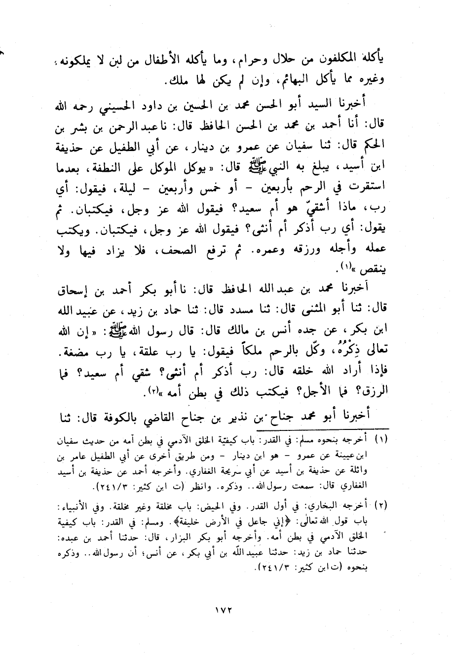 أَخْبَرَنَا السَّيِّدُ أَبُو الْحَسَنِ مُحَمَّدُ بْنُ الْحُسَيْنِ بْنِ دَاوُدَ الْحُسَيْنِيُّ رَحِمَهُ اللَّهُ قَالَ، أنا أَحْمَدُ بْنُ مُحَمَّدِ بْنِ الْحَسَنِ الْحَافِظُ، قَالَ، نا عَبْدُ الرَّحْمَنِ بْنُ بِشْرِ بْنِ الْحَكَمِ، قَالَ، ثنا سُفْيَانُ، عَنْ عَمْرِو بْنِ دِينَارٍ، عَنْ أَبِي الطُّفَيْلِ، عَنْ حُذَيْفَةَ بْنِ أَسِيدٍ، يَبْلُغُ بِهِ النَّبِيَّ صَلَّى اللهُ عَلَيْهِ وَسَلَّمَ قَالَ: §" يُوَكَّلُ الْمُوكَّلُ عَلَى النُّطْفَةِ بَعْدَمَا تَسْتَقِرُّ فِي الرَّحِمِ بِأَرْبَعِينَ أَوْ خَمْسٍ وَأَرْبَعِينَ لَيْلَةً فَيَقُولُ: أَيْ رَبِّ مَاذَا أَشَقِيٌّ هُوَ أَوْ سَعِيدٌ؟ فَيَقُولُ اللَّهُ عَزَّ وَجَلَّ فَيَكْتُبَانِ، ثُمَّ يَقُولُ: أَيْ رَبِّ أَذَكَرٌ أَمْ أُنْثَى؟ فَيَقُولُ اللَّهُ عَزَّ وَجَلَّ فَيَكْتُبَانِ، وَيُكْتَبُ عَمَلُهُ وَأَجَلُهُ وَرِزْقُهُ وَعُمْرُهُ ثُمَّ تُرْفَعُ الصُّحُفُ فَلَا يُزَادُ فِيهَا وَلَا يُنْقَصُ "