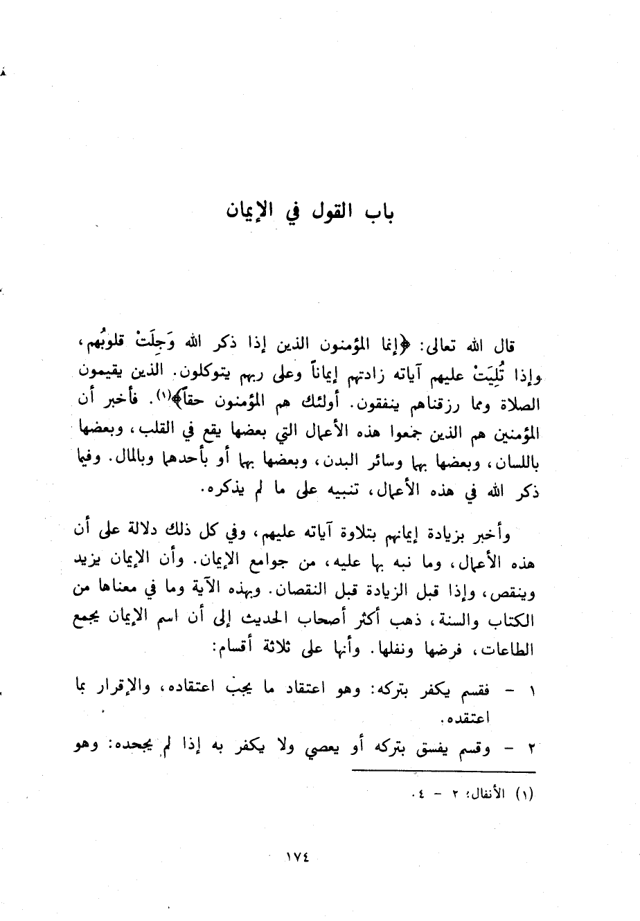 §بَابٌ الْقَوْلُ فِي الْإِيمَانِ قَالَ اللَّهُ تَعَالَى إِنَّمَا الْمُؤْمِنُونَ الَّذِينَ إِذَا ذُكِرَ اللَّهُ وَجِلَتْ قُلُوبُهُمْ وَإِذَا تُلِيَتْ عَلَيْهِمْ آيَاتُهُ زَادَتْهُمْ إِيمَانًا وَعَلَى رَبِّهِمْ يَتَوكَّلُونَ الَّذِينَ يُقِيمُونَ الصَّلَاةَ وَمِمَّا رَزَقْنَاهُمْ يُنْفِقُونَ أَوْلَئِكَ هُمُ الْمُؤْمِنُونَ حَقًّا فَأَخْبَرَ أَنَّ الْمُؤْمِنِينَ هُمُ الَّذِينَ جَمَعُوا هَذِهِ الْأَعْمَالَ الَّتِي بَعْضُهَا يَقَعُ فِي الْقَلْبِ وَبَعْضُهَا بِاللِّسَانِ وَبَعْضُهَا بِهِمَا وَسَائِرِ الْبَدَنِ، وَبَعْضُهَا بِهِمَا أَوْ بِأَحَدِهِمَا وَبِالْمَالِ، وَفِيمَا ذَكَرَ اللَّهُ فِي هَذِهِ الْأَعْمَالِ تَنْبِيهٌ عَلَى مَا لَمْ يَذْكُرُهُ، وَأَخْبَرَ بِزِيَادَةِ إِيمَانِهِمْ بِتِلَاوَةِ آيَاتِهِ عَلَيْهِمْ، وَفِي كُلِّ ذَلِكَ دَلَالَةٌ عَلَى أَنَّ هَذِهِ الْأَعْمَالَ وَمَا نَبَّهَ بِهَا عَلَيْهِ مِنْ جَوَامِعِ الْإِيمَانِ، وَأَنَّ الْإِيمَانَ يَزِيدُ وَيَنْقُصُ وَإِذَا قَبِلَ الزِّيَادَةَ قَبِلَ النُّقْصَانَ، وَبهَذِهِ الْآيَةِ وَمَا فِي مَعْنَاهَا مِنَ الْكِتَابِ وَالسُّنَّةِ ذَهَبَ أَكْثَرُ أَصْحَابِ الْحَدِيثِ إِلَى أَنَّ اسْمَ الْإِيمَانِ يَجْمَعُ الطَّاعَاتِ فَرْضِهَا وَنَفْلِهَا وَأَنَّهَا عَلَى ثَلَاثَةِ أَقْسَامٍ: 1 - فَقِسْمٌ يَكْفُرُ بِتَرْكِهِ، وَهُوَ اعْتِقَادُ مَا يَجِبُ اعْتِقَادُهُ وَالْإِقْرَارُ بِمَا اعْتَقَدَهُ. 2 - وَقِسْمٌ يَفْسُقُ بِتَرْكِهِ أَوْ يَعْصِي وَلَا يَكْفُرُ بِهِ إِذَا لَمْ يَجْحَدْهُ وَهُوَ