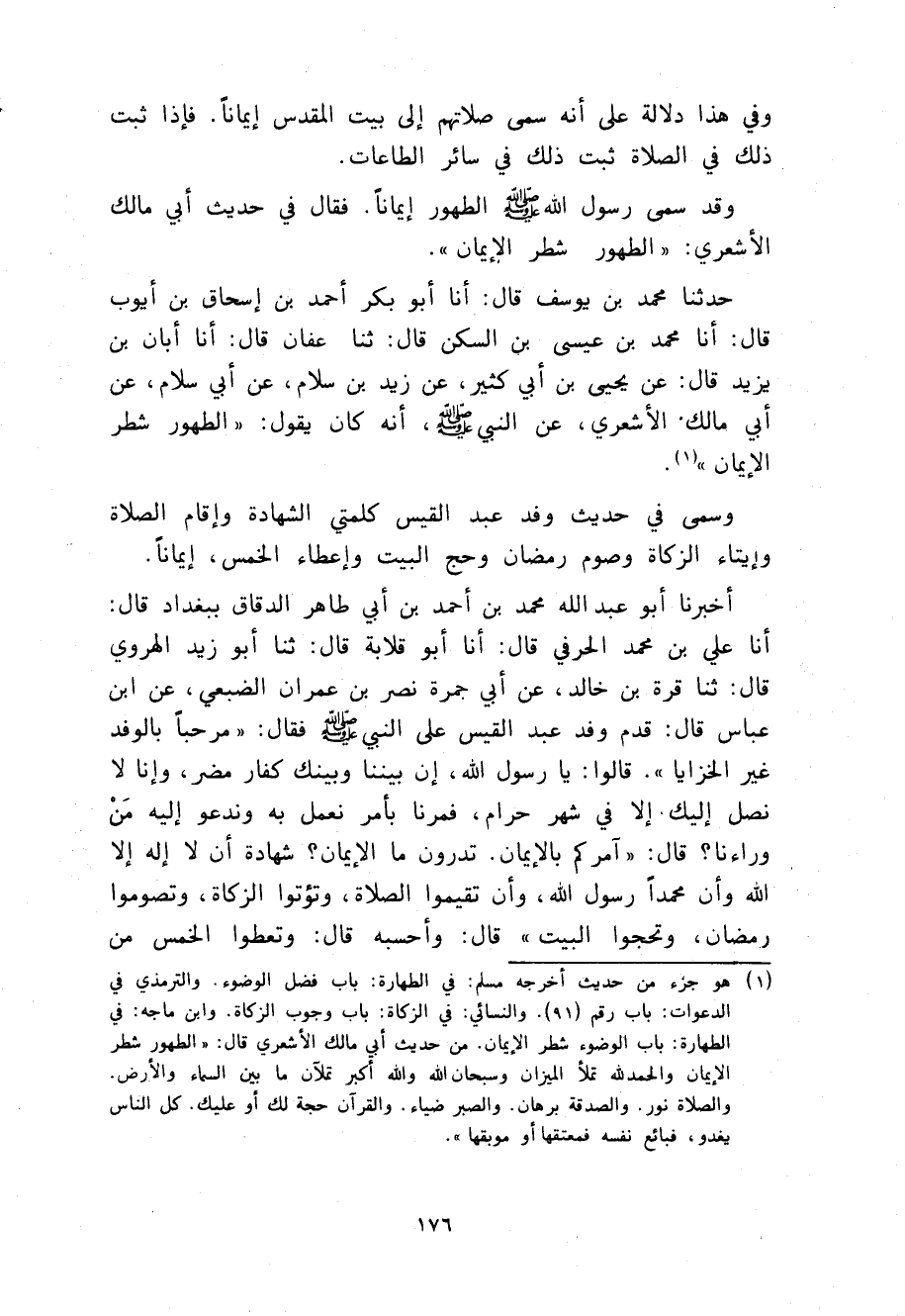 حَدَّثَنَاهُ أَبُو مُحَمَّدِ بْنُ يُوسُفَ، قَالَ، أنا أَبُو بَكْرٍ أَحْمَدُ بْنُ إِسْحَاقَ بْنِ أَيُّوبَ قَالَ، أنا مُحَمَّدُ بْنُ عِيسَى بْنِ السَّكَنِ، قَالَ، ثنا عَفَّانُ، قَالَ: نا أَبَانُ بْنُ يَزِيدَ، قَالَ: عَنْ يَحْيَى بْنِ أَبِي كَثِيرٍ، عَنْ زَيْدِ بْنِ سَلَّامٍ، عَنْ أَبِي سَلَّامٍ، عَنْ أَبِي مَالِكٍ الْأَشْعَرِيِّ، عَنِ النَّبِيِّ صَلَّى اللهُ عَلَيْهِ وَسَلَّمَ أَنَّهُ كَانَ يَقُولُ: §«الطُّهُورُ شَطْرُ الْإِيمَانِ» وَسَمَّى فِي حَدِيثِ وَفْدِ عَبْدِ الْقَيْسِ كَلِمَتَيِ الشَّهَادَةِ، وَإِقَامَ الصَّلَاةِ، وَإِيتَاءَ الزَّكَاةِ، وَصومَ رَمَضَانَ، وَحَجَّ الْبَيْتِ، وَإِعَطَاءَ الْخُمُسِ إِيمَانًا