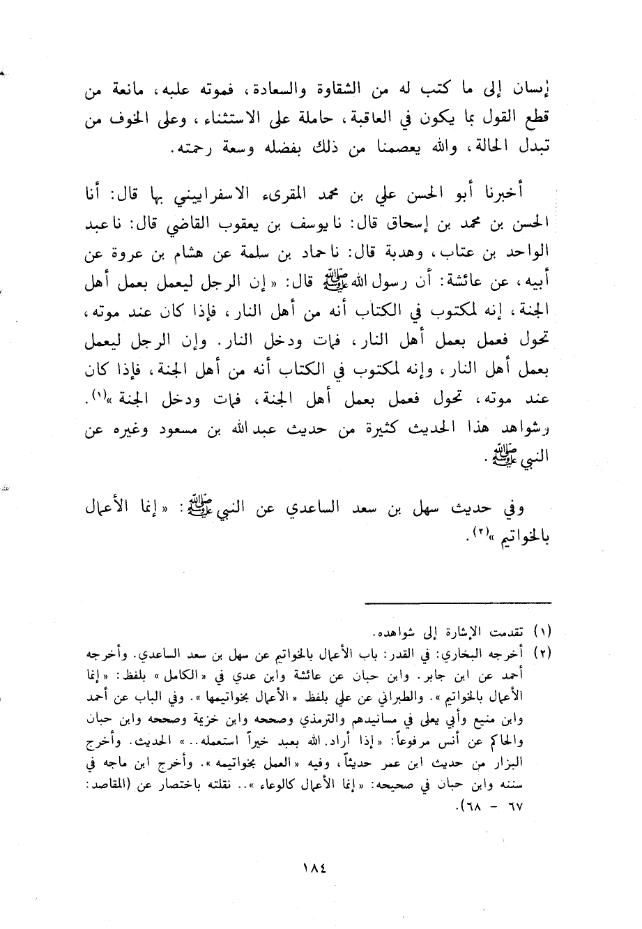 أَخْبَرَنَا أَبُو الْحَسَنِ عَلِيُّ بْنُ مُحَمَّدٍ الْمُقْرِئُ الْإِسْفَرَائِينِيُّ بِهَا قَالَ: أنا الْحَسَنُ بْنُ مُحَمَّدِ بْنِ إِسْحَاقَ، قَالَ: نا يُوسُفُ بْنُ يَعْقُوبَ الْقَاضِي، قَالَ: نا عَبْدُ الْوَاحِدِ بْنُ غِيَاثٍ، وَهُدْبَةُ، قَالَ: نا حَمَّادُ بْنُ سَلَمَةَ، عَنْ هِشَامِ بْنِ عُرْوَةَ، عَنْ أَبِيهِ، عَنْ عَائِشَةَ، أَنَّ رَسُولَ اللَّهِ صَلَّى اللهُ عَلَيْهِ وَسَلَّمَ قَالَ: إِنَّ §الرَّجُلَ لَيَعْمَلُ بِعَمَلِ أَهْلِ الْجَنَّةِ وَإِنَّهُ لَمَكْتُوبٌ فِي الْكِتَابِ أَنَّهُ مِنْ أَهْلِ النَّارِ فَإِذَا كَانَ عِنْدَ مَوْتِهِ تَحَوَّلَ فَعَمِلَ بِعَمَلِ أَهْلِ النَّارِ فَمَاتَ وَدَخَلَ النَّارَ، وَإِنَّ الرَّجُلَ لَيَعْمَلُ بِعَمَلِ أَهْلِ النَّارِ، وَإِنَّهُ لَمَكْتُوبٌ فِي الْكِتَابِ أَنَّهُ مِنْ أَهْلِ الْجَنَّةِ فَإِذَا كَانَ عِنْدَ مَوْتِهِ تَحَوَّلَ فَعَمِلَ بِعَمَلِ أَهْلِ الْجَنَّةِ فَمَاتَ وَدَخَلَ الْجَنَّةَ. وَشَوَاهِدُ هَذَا الْحَدِيثِ كَثِيرَةٌ مِنْ حَدِيثِ عَبْدِ اللَّهِ بْنِ مَسْعُودٍ وَغَيْرِهِ، عَنِ النَّبِيِّ صَلَّى اللهُ عَلَيْهِ وَسَلَّمَ وَفِي حَدِيثِ سَهْلِ بْنِ سَعْدٍ السَّاعِدِيِّ، عَنِ النَّبِيِّ صَلَّى اللهُ عَلَيْهِ وَسَلَّمَ «إِنَّمَا الْأَعْمَالُ بِالْخَوَاتِيمِ» -[185]- وَفِي حَدِيثِ أُسَامَةَ بْنِ زَيْدٍ، عَنِ النَّبِيِّ صَلَّى اللهُ عَلَيْهِ وَسَلَّمَ فِي صِفَةِ الْجَنَّةِ قَالَ: " فَقَالُوا: نَحْنُ الْمُشَمِّرُونَ لَهَا يَا رَسُولَ اللَّهِ، قَالَ: «قُولُوا إِنْ شَاءَ اللَّهُ»