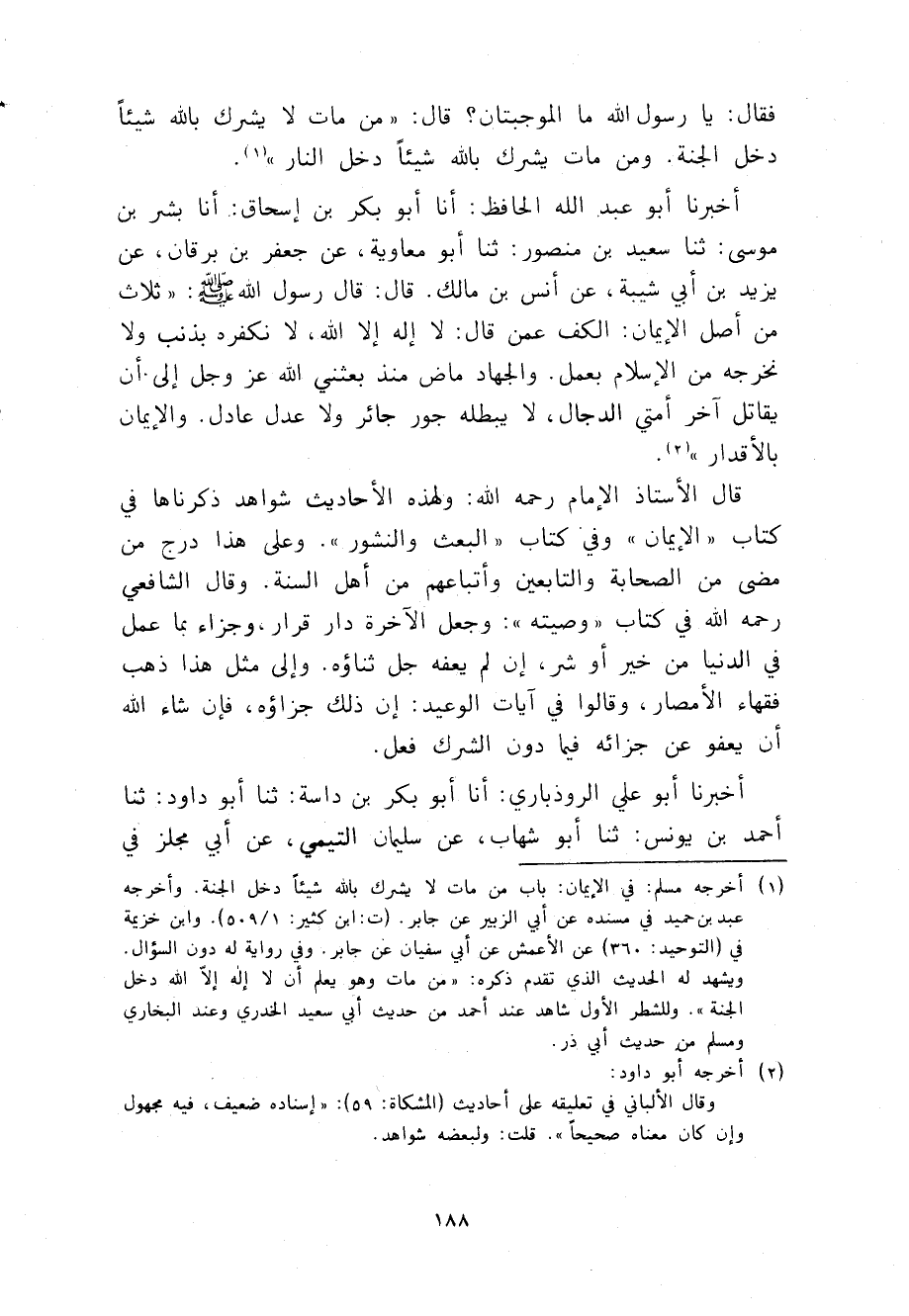 أَخْبَرَنَا أَبُو عَبْدِ اللَّهِ الْحَافِظُ، أنا أَبُو بَكْرِ بْنُ إِسْحَاقَ، أنا بِشْرُ بْنُ مُوسَى، ثنا سَعِيدُ بْنُ مَنْصُورٍ، ثنا أَبُو مُعَاوِيَةَ، عَنْ جَعْفَرِ بْنِ بُرْقَانَ، عَنْ يَزِيدَ بْنِ أَبِي شَيْبَةَ، عَنْ أَنَسِ بْنِ مَالِكٍ، قَالَ: " قَالَ رَسُولُ اللَّهِ صَلَّى اللهُ عَلَيْهِ وَسَلَّمَ: «§ثَلَاثٌ مِنْ أَصْلِ الْإِيمَانِ، الْكَفُّ عَمَّنْ قَالَ لَا إِلَهَ إِلَّا اللَّهُ لَا نُكَفِّرُهُ بِذَنْبٍ، وَلَا نُخْرِجُهُ مِنَ الْإِسْلَامِ بِعَمَلٍ، وَالْجِهَادُ مَاضٍ مُنْذُ بَعَثَنِي اللَّهُ عَزَّ وَجَلَّ إِلَى أَنْ يُقَاتِلَ آخِرُ أُمَّتِي الدَّجَّالَ لَا يُبْطِلُهُ جَوْرُ جَائِرٍ وَلَا عَدْلُ عَادِلٍ، وَالْإِيمَانُ بِالْأَقْدَارِ» . قَالَ الْأُسْتَاذُ الْإِمَامُ رَحِمَهُ اللَّهُ: وَلِهَذِهِ الْأَحَادِيثِ شَوَاهِدُ ذَكَرْنَاهَا فِي كِتَابِ الْإِيمَانِ وَفِي كِتَابِ الْبَعْثِ وَالنُّشُورِ وَعَلَى هَذَا دَرَجَ مَنْ مَضَى مِنَ الصَّحَابَةِ وَالتَّابِعِينَ وَأَتْبَاعِهِمْ مِنْ أَهْلِ السُّنَّةِ، وَقَالَ الشَّافِعِيُّ رَحِمَهُ اللَّهُ فِي كِتَابِ وَصِيَّتِهِ: وَجَعَلَ الْآخِرَةَ دَارَ قَرَارٍ وَجَزَاءٍ بِمَا عَمِلَ فِي الدُّنيَا مِنْ خَيْرٍ أَوْ شَرٍّ إِنْ لَمْ يُعْفِهِ جَلَّ ثَنَاؤُهُ، وَإِلَى مِثْلِ هَذَا ذَهَبَ فُقَهَاءُ الْأَمْصَارِ وَقَالُوا فِي آيَاتِ الْوَعِيدِ: إِنَّ ذَلِكَ جَزَاؤُهُ، فَإِنْ شَاءَ اللَّهُ أَنْ يَعْفُوَ عَنْ جَزَائِهِ فِيمَا دُونَ الشِّرْكِ فَعَلَ