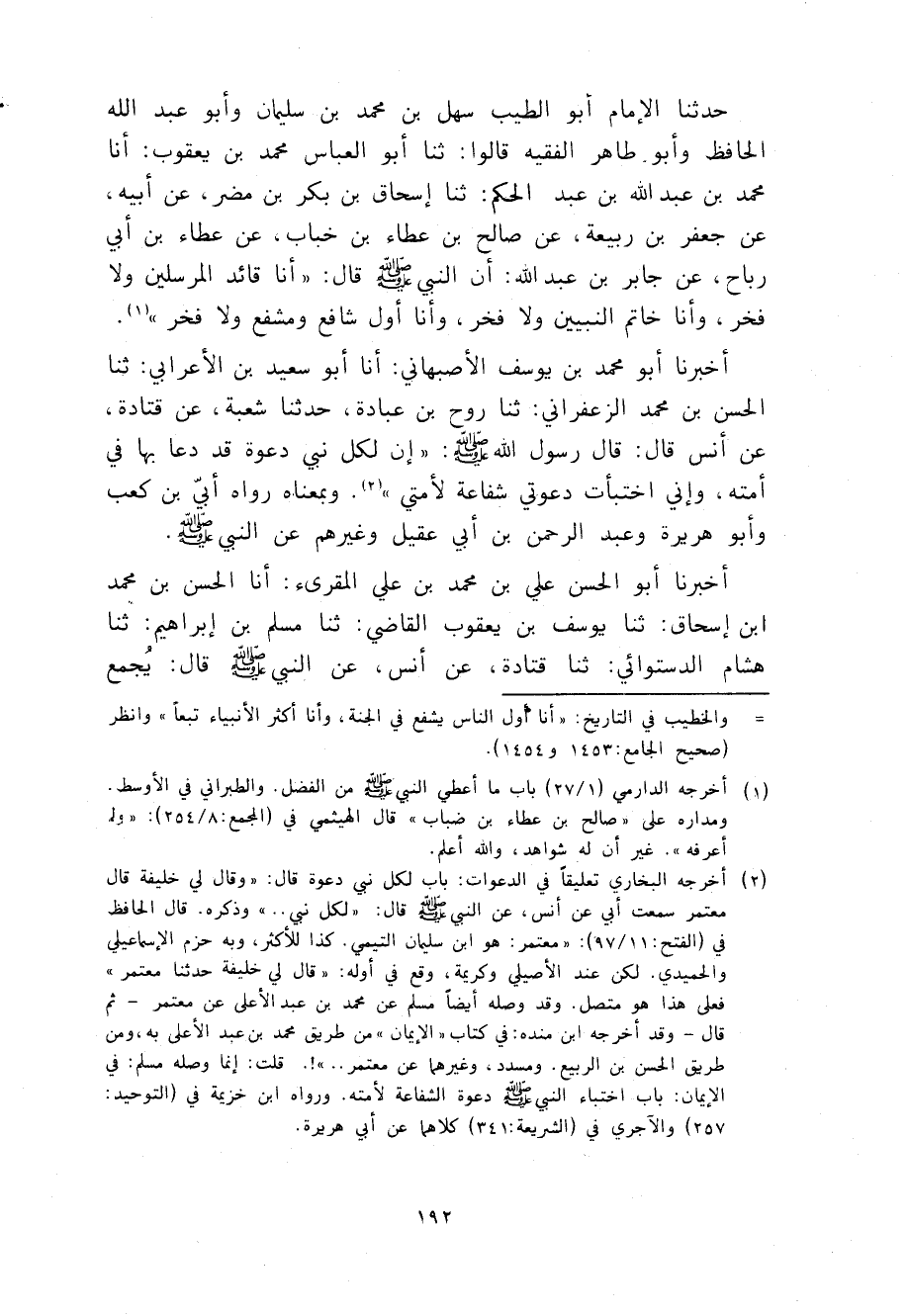 حَدَّثَنَا الْإِمَامُ أَبُو الطَّيِّبِ سَهْلُ بْنُ مُحَمَّدِ بْنِ سُلَيْمَانَ، وَأَبُو عَبْدِ اللَّهِ الْحَافِظُ، وَأَبُو طَاهِرٍ الْفَقِيهُ قَالُوا: ثنا أَبُو الْعَبَّاسِ مُحَمَّدُ بْنُ يَعْقُوبَ، أنا مُحَمَّدُ بْنُ عَبْدِ اللَّهِ بْنِ عَبْدِ الْحَكَمِ، ثنا إِسْحَاقُ بْنُ بَكْرِ بْنِ مُضَرَ، عَنْ أَبِيهِ، عَنْ جَعْفَرِ بْنِ رَبِيعَةَ، عَنْ صَالِحِ بْنِ عَطَاءِ بْنِ خَبَّابٍ، عَنْ عَطَاءِ بْنِ أَبِي رَبَاحٍ، عَنْ جَابِرِ بْنِ عَبْدِ اللَّهِ، أَنَّ النَّبِيَّ صَلَّى اللهُ عَلَيْهِ وَسَلَّمَ قَالَ: «§أَنَا قَائِدُ الْمُرْسَلِينَ وَلَا فَخْرَ، وَأَنَا خَاتَمُ النَّبِيِّينَ وَلَا فَخْرَ، وَأَنَا أَوَّلُ شَافِعٍ وَمُشَفَّعٍ وَلَا فَخْرَ»