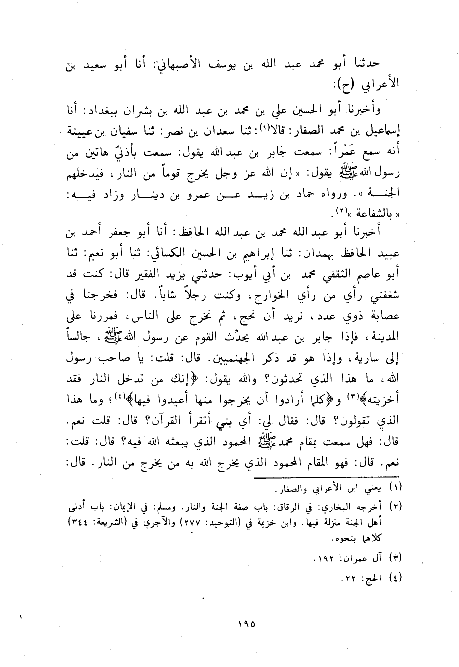 حَدَّثَنَا أَبُو مُحَمَّدٍ عَبْدُ اللَّهِ بْنُ يُوسُفَ الْأَصْبَهَانِيُّ، أنا أَبُو سَعِيدِ بْنُ الْأَعْرَابِيِّ، (ح) . وَأَخْبَرَنَا أَبُو الْحُسَيْنِ عَلِيُّ بْنُ مُحَمَّدِ بْنِ عَبْدِ اللَّهِ بْنِ بِشْرَانَ بِبَغْدَادَ، أنا إِسْمَاعِيلُ بْنُ مُحَمَّدٍ الصَّفَّارُ، قَالَا: ثنا سَعْدَانُ بْنُ نَصْرٍ، ثنا سُفْيَانُ بْنُ عُيَيْنَةَ، أَنَّهُ سَمِعَ عَمْرٌو جَابِرَ بْنَ عَبْدِ اللَّهِ، يَقُولُ: سَمِعْتُ بِأُذُنَيَّ، هَاتَيْنِ مِنْ رَسُولِ اللَّهِ صَلَّى اللهُ عَلَيْهِ وَسَلَّمَ يَقُولُ: «إِنَّ اللَّهَ عَزَّ وَجَلَّ §يُخْرِجُ قَوْمًا مِنَ النَّارِ فَيُدْخِلُهُمُ الْجَنَّةَ» وَرَوَاهُ حَمَّادُ بْنُ زَيْدٍ، عَنْ عَمْرِو بْنِ دِينَارٍ وَزَادَ فِيهِ «بِالشَّفَاعَةِ»