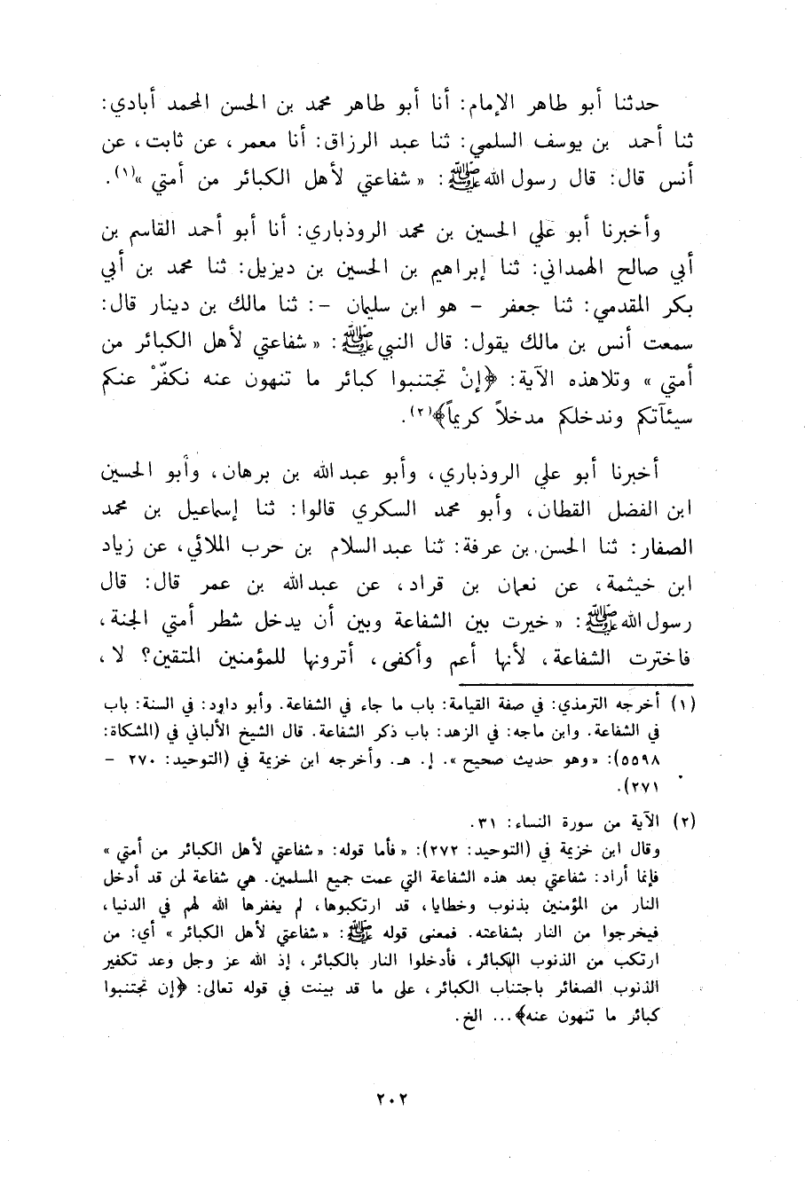 وَأَخْبَرَنَا أَبُو عَلِيٍّ الْحُسَيْنُ بْنُ مُحَمَّدٍ الرُّوذْبَارِيُّ، أنا أَبُو أَحْمَدَ الْقَاسِمُ بْنُ أَبِي صَالِحٍ الْهَمْدَانِيُّ، ثنا إِبْرَاهِيمُ بْنُ الْحُسَيْنِ بْنِ دِيزِيلَ، ثنا مُحَمَّدُ بْنُ أَبِي بَكْرٍ الْمُقَدَّمِيُّ، ثنا جَعْفَرٌ هُوَ ابْنُ سُلَيْمَانَ، ثنا مَالِكُ بْنُ دِينَارٍ، قَالَ: سَمِعْتُ أَنَسَ بْنَ مَالِكٍ، يَقُولُ: قَالَ النَّبِيُّ صَلَّى اللهُ عَلَيْهِ وَسَلَّمَ: §شَفَاعَتِي لِأَهْلِ الْكَبَائِرِ مِنْ أُمَّتِي وَتَلَا هَذِهِ الْآيَةَ {إِنْ تَجْتَنِبُوا كَبَائِرَ مَا تُنْهَوْنَ عَنْهُ نُكَفِّرْ عَنْكُمْ سَيِّئَاتِكُمْ وَنُدْخِلْكُمْ مُدْخًلَا كَرِيمًا} [النساء: 31]