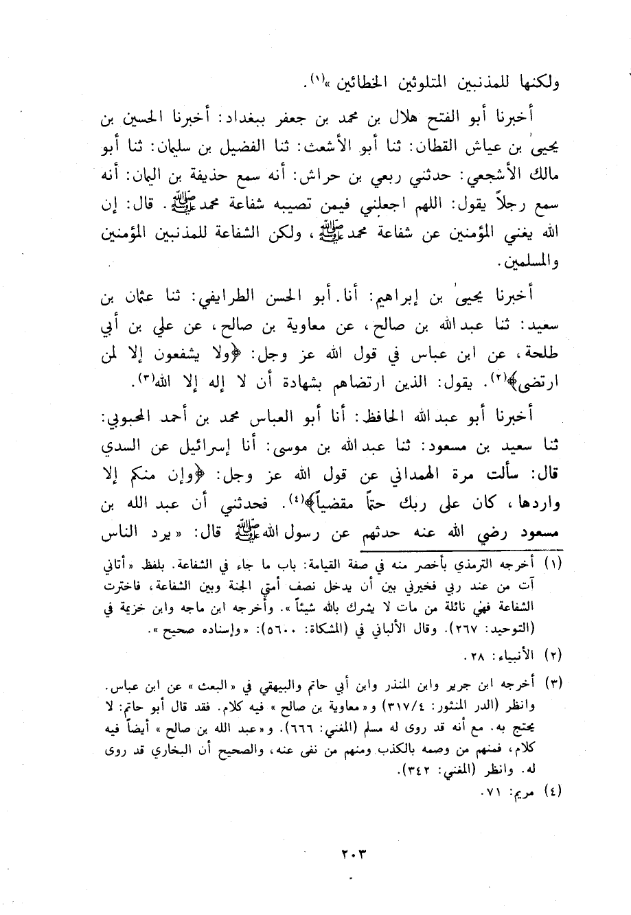 أَخْبَرَنَا أَبُو الْفَتْحِ هِلَالُ بْنُ مُحَمَّدِ بْنِ جَعْفَرٍ بِبَغْدَادَ، أَخْبَرَنَا الْحُسَيْنُ بْنُ يَحْيَى بْنِ عَيَّاشٍ الْقَطَّانُ، ثنا أَبُو الْأَشْعَثِ، ثنا الْفُضَيْلُ بْنُ سُلَيْمَانَ، ثنا أَبُو مَالِكٍ الْأَشْجَعِيُّ، حَدَّثَنِي رِبْعِيُّ بْنُ حِرَاشٍ، أَنَّهُ سَمِعَ حُذَيْفَةَ بْنَ الْيَمَانِ، أَنَّهُ سَمِعَ رَجُلًا، يَقُولُ: اللَّهُمَّ اجْعَلْنِي فِيمَنْ تُصِيبُهُ شَفَاعَةُ مُحَمَّدٍ صَلَّى اللهُ عَلَيْهِ وَسَلَّمَ، قَالَ: إِنَّ §اللَّهَ يُغْنِي الْمُؤْمِنِينَ عَنْ شَفَاعَةِ مُحَمَّدٍ صَلَّى اللهُ عَلَيْهِ وَسَلَّمَ، وَلَكِنَّ الشَّفَاعَةَ لِلْمُذْنِبِينَ الْمُؤْمِنِينَ وَالْمُسْلِمِينَ "