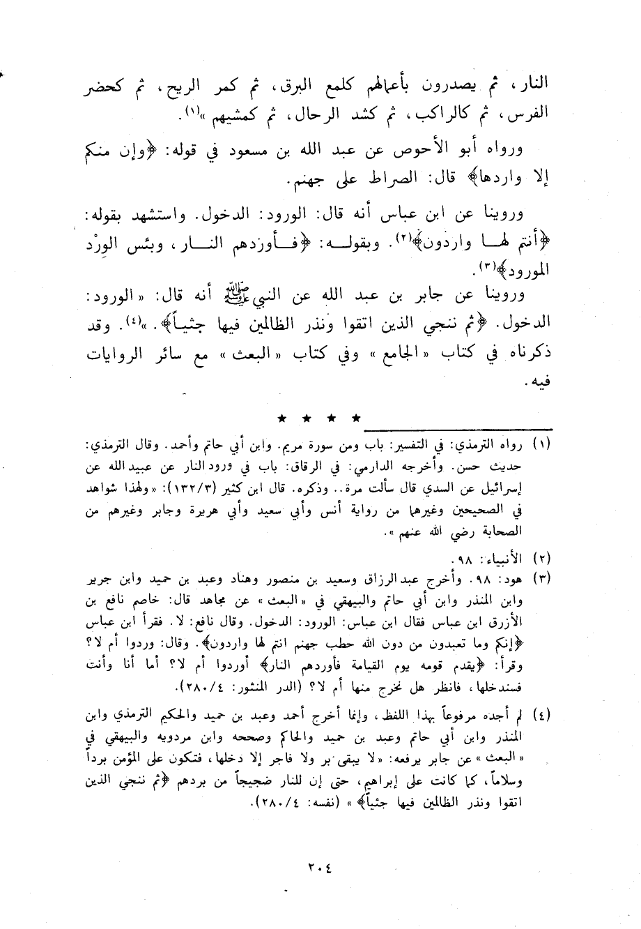 وَرُوِّينَا عَنْ جَابِرِ بْنِ عَبْدِ اللَّهِ، عَنِ النَّبِيِّ صَلَّى اللهُ عَلَيْهِ وَسَلَّمَ أَنَّهُ قَالَ: §الْوُرُودُ الدُّخُولُ {ثُمَّ نُنَجِّي الَّذِينَ اتَّقَوْا وَنَذَرُ الظَّالِمِينَ فِيهَا جِثِيًّا} [مريم: 72] وَقَدْ ذَكَرْنَاهُ فِي كِتَابِ الْجَامِعِ وَفِي كِتَابِ الْبَعْثِ مَعَ سَائِرِ الرِّوَايَاتِ فِيهِ