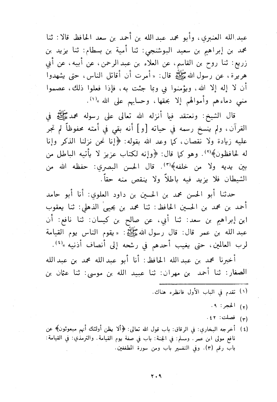 حَدَّثَنَا السَّيِّدُ أَبُو الْحَسَنِ مُحَمَّدُ بْنُ الْحُسَيْنِ بْنِ دَاوُدَ الْعَلَوِيُّ، أنا أَبُو حَامِدٍ أَحْمَدُ بْنُ مُحَمَّدِ بْنِ الْحَسَنِ الْحَافِظُ، ثنا مُحَمَّدُ بْنُ يَحْيَى الذُّهْلِيُّ، ثنا يَعْقُوبُ بْنُ إِبْرَاهِيمَ بْنِ سَعْدٍ، ثنا أَبِي، عَنْ صَالِحِ بْنِ كَيْسَانَ، ثنا نَافِعٌ، أَنَّ عَبْدَ اللَّهِ بْنَ عُمَرَ قَالَ: قَالَ رَسُولُ اللَّهِ صَلَّى اللهُ عَلَيْهِ وَسَلَّمَ: §«يَقُومُ النَّاسُ يَوْمَ الْقِيَامَةِ لِرَبِّ الْعَالَمِينَ حَتَّى يَغِيبَ أَحَدُهُمْ فِي رَشْحِهِ إِلَى أَنْصَافِ أُذُنَيْهِ»