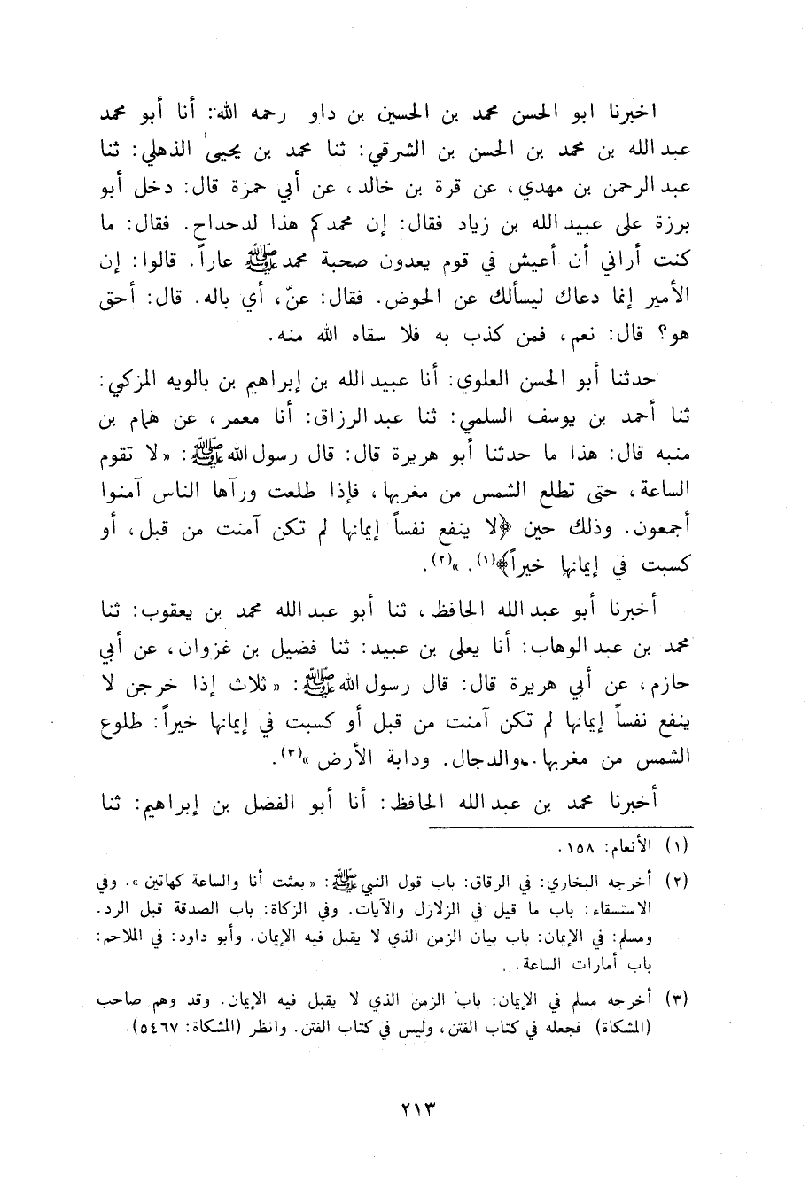 أَخْبَرَنَا أَبُو عَبْدِ اللَّهِ الْحَافِظُ، ثنا أَبُو عَبْدِ اللَّهِ مُحَمَّدُ بْنُ يَعْقُوبَ، ثنا مُحَمَّدُ بْنُ عَبْدِ الْوَهَّابِ، أنا يَعْلَى بْنُ عُبَيْدٍ، ثنا فُضَيْلُ بْنُ غَزْوَانَ، عَنْ أَبِي حَازِمٍ، عَنْ أَبِي هُرَيْرَةَ، قَالَ: قَالَ رَسُولُ اللَّهِ صَلَّى اللهُ عَلَيْهِ وَسَلَّمَ: §" ثَلَاثٌ إِذَا خَرَجْنَ لَا يَنْفَعُ نَفْسًا إِيمَانُهَا لَمْ تَكُنْ آمَنَتْ مِنْ قبْلُ، أَوْ كَسَبَتْ فِي إِيمَانِهَا خَيْرًا: طُلُوعُ الشَّمْسِ مِنْ مَغْرِبِهَا، وَالدَّجَّالُ وَدَابَّةُ الْأَرْضِ "