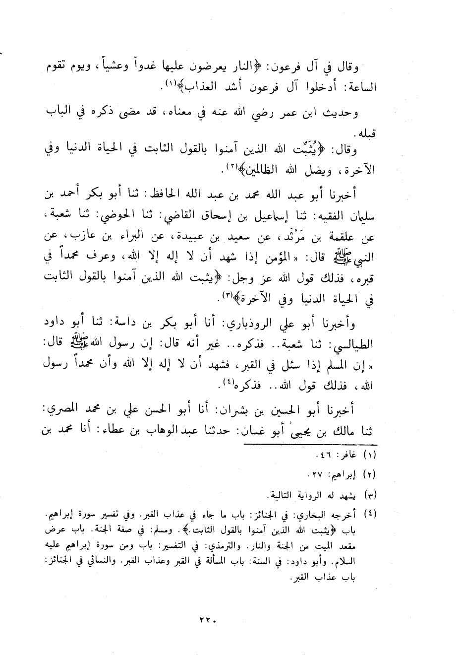 ، وَقَالَ فِي آلِ فِرْعَوْنَ {النَّارُ يُعْرَضُونَ عَلَيْهَا غُدُوًّا وَعَشِيًّا، وَيَوْمَ تَقُومُ السَّاعَةُ أَدْخِلُوا آلَ فِرْعَوْنَ أَشَدَّ الْعَذَابِ} [غافر: 46] وَحَدِيثُ ابْنِ عُمَرَ رَضِيَ اللَّهُ عَنْهُ فِي مَعْنَاهُ قَدْ مَضَى ذِكْرُهُ فِي الْبَابِ قَبْلَهُ، وَقَالَ: {يُثَبِّتُ اللَّهُ الَّذِينَ آمَنُوا بِالْقَوْلِ الثَّابِتِ فِي الْحَيَاةِ الدُّنْيَا وَفِي الْآخِرَةِ وَيُضِلُّ اللَّهُ الظَّالِمِينَ} [إبراهيم: 27]