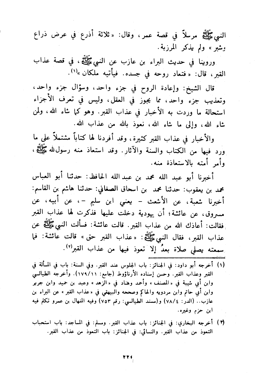 وَرُوِّينَا فِي، حَدِيثِ الْبَرَاءِ بْنِ عَازِبٍ، عَنِ النَّبِيِّ صَلَّى اللهُ عَلَيْهِ وَسَلَّمَ فِي قِصَّةِ عَذَابِ الْقبْرِ قَالَ: §فَتُعَادُ رُوحُهُ فِي جَسَدِهِ فَيَأْتِيهِ مَلَكَانِ قَالَ الشَّيْخُ: وَإِعَادَةُ الرُّوحِ فِي جُزْءٍ وَاحِدٍ، وَسُؤَالُ جُزْءٍ وَاحِدٍ وَتعْذِيبُ جُزْءٍ وَاحِدٍ مِمَّا يَجُوزُ فِي الْعَقْلِ وَلَيْسَ فِي تَفَرُّقِ الْأَجْزَاءِ اسْتِحَالَةُ مَا وَرَدَتْ بِهِ الْأَخْبَارُ فِي عَذَابِ الْقَبْرِ، وَهُوَ كَمَا شَاءَ اللَّهُ وَلِمَنْ شَاءَ اللَّهُ، وَإِلَى مَا شَاءَ اللَّهُ نَعُوذُ بِاللَّهِ مِنْ عَذَابِ اللَّهِ وَالْأَخْبَارُ فِي عَذَابِ الْقَبْرِ كَثِيرَةٌ، وَقَدْ أَفْرَدْنَا لَهَا كِتَابًا مُشْتَمِلًا عَلَى مَا وَرَدَ فِيهَا مِنَ الْكِتَابِ وَالسُّنَّةِ وَالْآثَارِ، وَقَدِ اسْتَعَاذَ مِنْهُ رَسُولُ اللَّهِ صَلَّى اللهُ عَلَيْهِ وَسَلَّمَ وَأَمَرَ أُمَّتَهُ بِالِاسْتِعَاذَةِ مِنْهُ