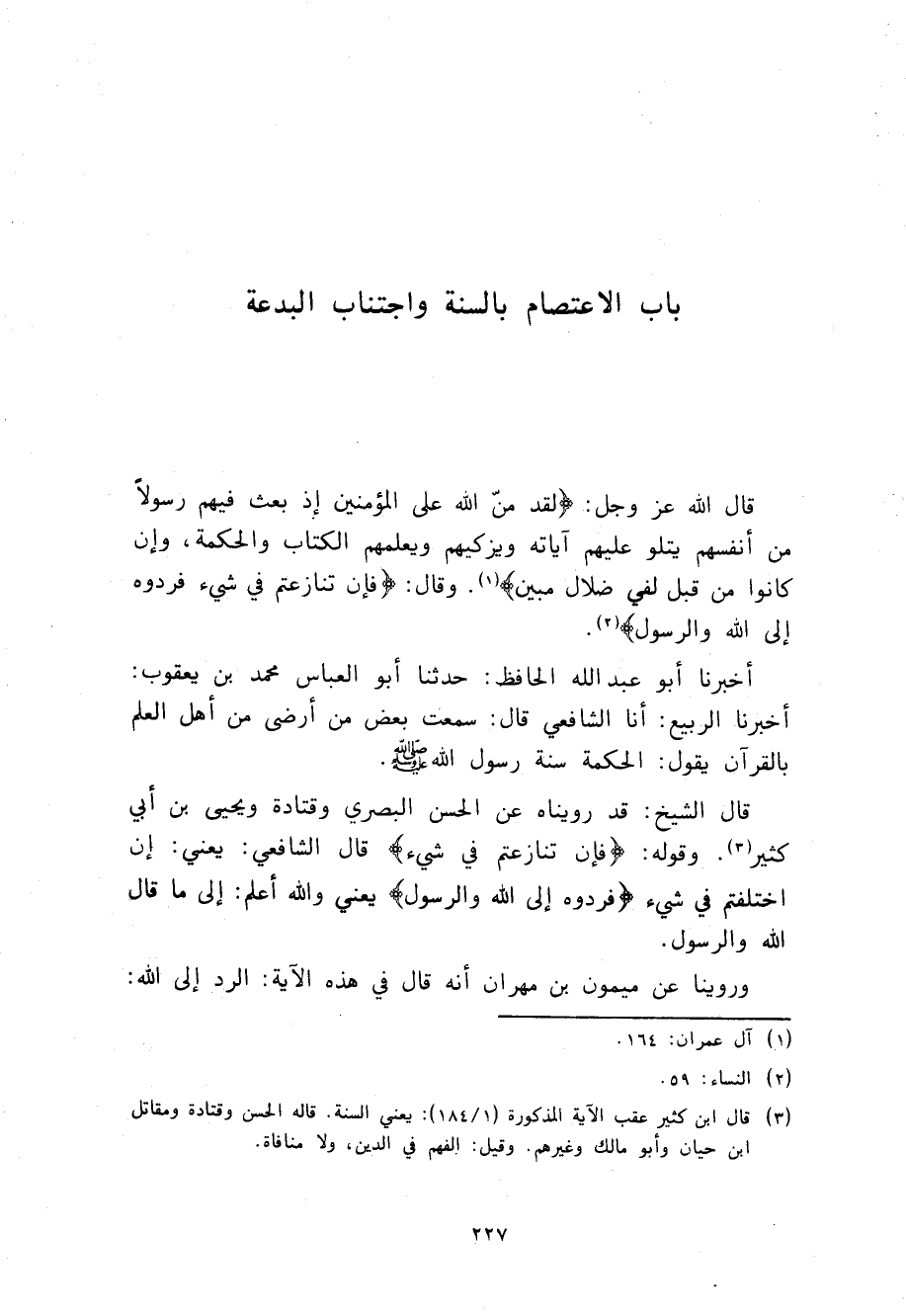 §بَابُ الِاعْتِصَامِ بِالسُّنَّةِ وَاجْتِنَابِ الْبِدْعَةِ قَالَ اللَّهُ عَزَّ وَجَلَّ {لَقَدْ مَنَّ اللَّهُ عَلَى الْمُؤْمِنِينَ إِذْ بَعَثَ فَيهِمْ رَسُولًا مِنْ أَنْفُسِهِمْ يَتْلُو عَلَيْهِمْ آيَاتِهِ وَيُزَكِّيهِمْ وَيُعَلِّمُهُمُ الْكِتَابَ وَالْحِكْمَةَ، وَإِنْ كَانُوا مِنْ قَبْلُ لَفِي ضَلَالٍ مُبِينٍ} [آل عمران: 164] ، وَقَالَ: {فَإِنْ تَنَازَعْتُمْ فِي شَيْءٍ فَرُدُّوهُ إِلَى اللَّهِ وَالرَّسُولِ} [النساء: 59]