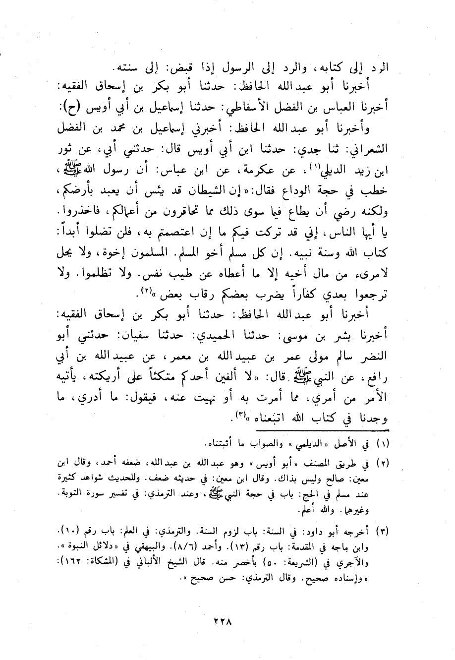 أَخْبَرَنَا أَبُو عَبْدِ اللَّهِ الْحَافِظُ، حَدَّثَنَا أَبُو بَكْرِ بْنُ إِسْحَاقَ الْفَقِيهُ، أَخْبَرَنَا الْعَبَّاسُ بْنُ الْفَضْلِ الْأَسْفَاطِيُّ، حَدَّثَنَا إِسْمَاعِيلُ بْنُ أَبِي أُوَيْسٍ، (ح) وَأَخْبَرَنَا أَبُو عَبْدِ اللَّهِ الْحَافِظُ، أَخْبَرَنِي إِسْمَاعِيلُ بْنُ مُحَمَّدِ بْنِ الْفَضْلِ الشَّعْرَانِيُّ، ثنا جَدِّي، حَدَّثَنَا ابْنُ أَبِي أُوَيْسٍ، قَالَ، حَدَّثَنِي أَبِي، عَنْ ثَوْرِ بْنِ زَيْدٍ الدَّيْلِيِّ، عَنْ عِكْرِمَةَ، عَنِ ابْنِ عَبَّاسٍ، أَنَّ رَسُولَ اللَّهِ صَلَّى اللهُ عَلَيْهِ وَسَلَّمَ خَطَبَ فِي حَجَّةِ الْوَدَاعِ، فَقَالَ: إِنَّ §الشَّيْطَانَ قَدْ يَئِسَ أَنْ يُعْبَدَ بِأَرْضِكُمْ وَلَكِنَّهُ رَضِيَ أَنْ يُطَاعَ فِيمَا سِوَى ذَلِكَ مِمَّا تَحَاقَرُونَ مِنْ أَعْمَالِكُمْ، فَاحْذَرُوا يَا أَيُّهَا النَّاسُ إِنِّي قَدْ تَرَكْتُ فِيكُمْ مَا إِنِ اعْتَصَمْتُمْ بِهِ فَلَنْ تَضِلُّوا أَبَدًا كِتَابَ اللَّهِ وَسُنَّةَ نَبِيِّهِ، إِنَّ كُلَّ مُسْلِمٍ أَخُو الْمُسْلِمِ الْمُسْلِمُونَ إِخَوَةٌ، وَلَا يَحِلُّ لَامْرِئٍ مِنْ مَالِ أَخِيهِ إِلَّا مَا أَعْطَاهُ عَنْ طِيبِ نَفْسٍ، وَلَا تَظْلِمُوا وَلَا تَرْجِعُوا بَعْدِي كُفَّارًا يَضْرِبُ بَعْضُكُمْ رِقَابَ بَعْضٍ