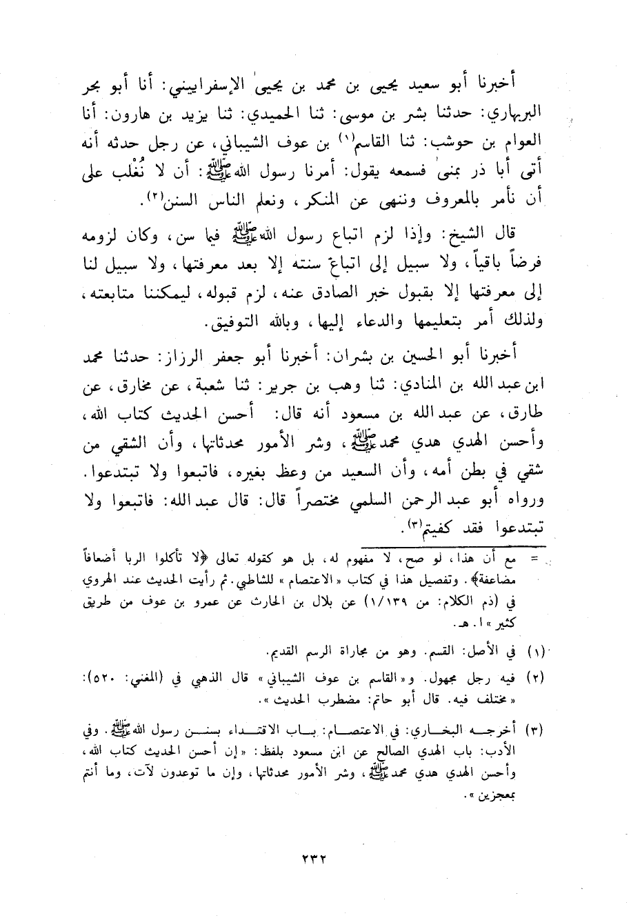 أَخْبَرَنَا أَبُو سَعِيدٍ يَحْيَى بْنُ مُحَمَّدِ بْنِ يَحْيَى الْإِسْفَرَايِينِيُّ، أنا أَبُو بَحْرٍ الْبَرْبَهَارِيُّ , حَدَّثَنَا بِشْرُ بْنُ مُوسَى , ثنا الْحُمَيْدِيُّ , ثنا يَزِيدُ بْنُ هَارُونَ , أنا الْعَوَّامُ بْنُ حَوْشَبٍ , ثنا الْقَاسِمُ بْنُ عَوْفٍ الشَّيْبَانِيُّ , عَنْ رَجُلٍ، حَدَّثَهُ أَنَّهُ، أَتَى أَبَا ذَرٍّ بِمِنًى فَسَمِعَهُ يَقُولُ: أَمَرَنَا رَسُولُ اللَّهِ صَلَّى اللهُ عَلَيْهِ وَسَلَّمَ أَنْ لَا نُغْلَبَ عَلَى أَنْ §نَأْمُرَ بِالْمَعْرُوفِ وَنَنْهَى عَنِ الْمُنْكَرِ وَنُعَلِّمَ النَّاسَ السُّنَنَ قَالَ الشَّيْخُ: وَإِذَا لَزِمَ اتِّبَاعُ رَسُولِ اللَّهِ صَلَّى اللهُ عَلَيْهِ وَسَلَّمَ فِيمَا سَنَّ وَكَانَ لُزُومُهُ فَرْضًا بَاقِيًا فَلَا سَبِيلَ إِلَى اتِّبَاعِ سُنَّتِهِ إِلَّا بَعْدَ مَعْرِفَتِهَا وَلَا سَبِيلَ لَنَا إِلَى مَعْرِفَتِهَا إِلَّا بِقُبُولِ خَبَرِ الصَّادقِ عَنْهُ لَزِمَ قُبُولُهُ لِيُمْكِنَنَا مُتَابَعَتَهُ وَلِذَلِكَ أَمَرَ بِتَعْلِيمَهَا وَالدُّعَاءِ إِلَيْهَا وَبِاللَّهِ التَّوْفِيقُ