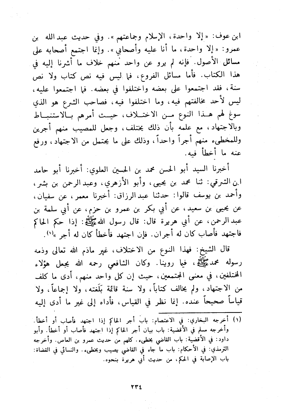 أَخْبَرَنَا السَّيِّدُ أَبُو الْحَسَنِ مُحَمَّدُ بْنُ الْحُسَيْنِ الْعَلَوِيُّ، أَخْبَرَنَا أَبُو حَامِدِ بْنِ الشَّرْقِيُّ , ثنا مُحَمَّدُ بْنُ يَحْيَى، وَأَبُو الْأَزْهَرِ، وَعَبْدُ الرَّحْمَنِ بْنُ بِشْرٍ , وَأَحْمَدُ بْنُ يُوسُفَ، قَالُوا: حَدَّثَنَا عَبْدُ الرَّزَّاقِ , أَخْبَرَنَا مَعْمَرٌ , عَنْ سُفْيَانَ , عَنْ يَحْيَى بْنِ سَعِيدٍ , عَنْ أَبِي بَكْرِ بْنِ عَمْرِو بْنِ حَزْمٍ , عَنْ أَبِي سَلَمَةَ بْنِ عَبْدِ الرَّحْمَنِ , عَنْ أَبِي هُرَيْرَةَ، قَالَ: قَالَ رَسُولُ اللَّهِ صَلَّى اللهُ عَلَيْهِ وَسَلَّمَ: §إِذَا حَكَمَ الْحَاكِمُ فَاجْتَهَدَ فَأَصَابَ كَانَ لَهُ أَجْرَانِ فَإِنِ اجْتَهَدَ فَأَخْطَأَ كَانَ لَهُ أَجْرٌ. قَالَ الشَّيْخُ: فَهَذَا النَّوْعُ مِنَ الِاخْتِلَافِ غَيْرُ مَا ذَمَّ اللَّهُ تَعَالَى وَذَمَّهُ رَسُولُهُ مُحَمَّدٌ صَلَّى اللهُ عَلَيْهِ وَسَلَّمَ فِيمَا رُوِّينَا، وَكَانَ الشَّافِعِيُّ رَحِمَهُ اللَّهُ يَجْعَلُ هَؤُلَاءِ الْمُخْتَلِفِينَ فِي مَعْنَى الْمُجْتَمِعِينَ حَيْثُ إِنَّ كُلَّ وَاحِدٍ مِنْهُمْ أَدَّى مَا كُلِّفَ مِنَ الَاجْتِهَادِ وَلَمْ يُخَالِفْ كِتَابًا وَلَا سُنَّةً قَائِمَةً بَلَغَتْهُ وَلَا إِجْمَاعًا وَلَا قِيَاسًا صَحِيحًا عِنْدَهُ، إِنَّمَا نَظَرَ فِي الْقِيَاسِ فَأَدَّاهُ إِلَى غَيْرِ مَا أَدَّى إِلَيْهِ -[235]- صَاحِبَهُ، كَمَا أَدَّاهُ التَّوَجُّهُ إِلَى الْبَيْتِ بِدَلَائِلِ النُّجُومِ وَغَيْرِهَا إِلَى غَيْرِ مَا أَدَّى إِلَيْهِ صَاحِبَهُ، فَكُلُّ وَاحِدٍ مِنْهُمْ يَكُونُ مُؤَدِّيًا فِي الظَّاهِرِ مَا كُلِّفَ وَيَرْفَعُ عَنْهُ إِثْمَ مَا غَابَ عَنْهُ أَوْ أَخْطَأَهُ مِنَ التَّأْوِيلِ الصَّحِيحِ أَوِ السُّنَّةِ الصَّحِيحَةِ أَوِ الْقِيَاسِ الصَّحِيحِ إِذْ لَمْ يُكَلَّفْ عِلْمَ الْغَيْبِ، فَمَنْ سَلَكَ مِنَ فُقَهَاءِ الْأَمْصَارِ سَبِيلَ الصَّحَابَةِ وَالتَّابِعِينَ فِيمَا أَجْمَعُوا عَلَيْهِ وَاخْتَلَفُوا فِيهِ كَانُوا كَالْفِرْقَةِ الْوَاحِدَةِ وَهِيَ الْفِرْقَةُ النَّاجِيَةُ الَّتِي أَشَارَ إِلَيْهَا رَسُولُ اللَّهِ صَلَّى اللهُ عَلَيْهِ وَسَلَّمَ، فَكُلٌّ مِنْهُمْ أَخَذَ بِوَثِيقَةٍ فِيمَا يَرَى فِيمَا تَبِعَ فِيهِ مِنَ الْكِتَابِ أَوِ السُّنَّةِ أَوِ الْإِجْمَاعِ وَبِاللَّهِ التَّوْفِيقُ وَأَمَّا تَخْلِيدُ مَنْ عَدَاهُمْ مِنْ أَهْلِ الْبِدَعِ فِي النَّارِ فَهُوَ مَبْنِيٌّ عَلَى تَكْفِيرِهِمْ فَمَنْ لَمْ يُكَفِّرْهُمْ أَجْرَاهُمْ بِالْخُرُوجِ مِنَ النَّارِ بِأَصْلِ الْإِيمَانِ مَجْرَى الْفُسَّاقِ الْمُسْلِمِينَ، وَحَمَلَ الْخَبَرَ عَلَى تَعْذِيبِهِمْ بِالنَّارِ مُدَّةً مِنَ الزَّمَانِ دُونَ الْأَبَدِ، وَاحْتَجَّ فِي تَرْكِ الْقَوْلِ بِتَكْفِيرِهِمْ بِقَوْلِهِ صَلَّى اللهُ عَلَيْهِ وَسَلَّمَ «تفْتَرِقُ أُمَّتِي» , فَجَعَلَ الْجَمِيعَ مَعَ افْتِرَاقِهِمْ مِنْ أُمَّتِهِ وَاللَّهُ أَعْلَمُ