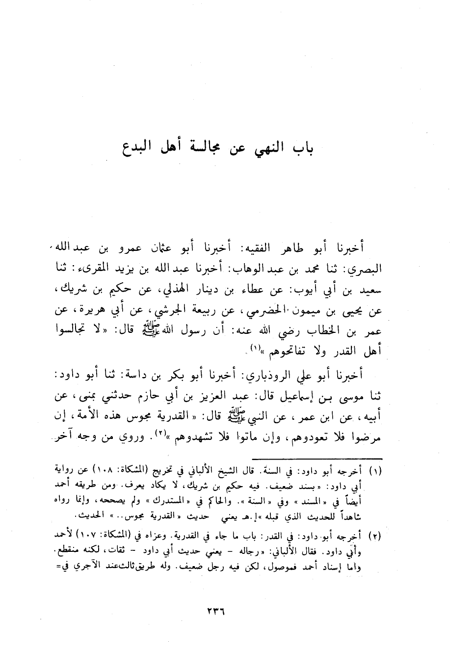 أَخْبَرَنَا أَبُو عَلِيٍّ الرُّوذْبَارِيُّ , أَخْبَرَنَا أَبُو بَكْرِ بْنُ دَاسَةَ , ثنا أَبُو دَاوُدَ , ثنا مُوسَى بْنُ إِسْمَاعِيلَ , قَالَ عَبْدُ الْعَزِيزِ بْنُ أَبِي حَازِمٍ: حَدَّثَنِي بِمِنًى , عَنْ أَبِيهِ , عَنِ ابْنِ عُمَرَ , عَنِ النَّبِيِّ صَلَّى اللهُ عَلَيْهِ وَسَلَّمَ قَالَ: §الْقَدَرِيَّةُ مَجُوسُ هَذِهِ الْأُمَّةِ إِنْ مَرِضُوا فَلَا تَعُودُوهُمْ، وَإِنْ مَاتُوا فَلَا تَشْهَدُوهُمْ وَرُوِيَ مِنْ وَجْهٍ آخَرَ -[237]- عَنِ ابْنِ عُمَرَ مِنْ قَوْلِهِ. وَرُوِيَ عَنْ حُذَيْفَةَ وَجَابِرٍ وَأَبِي هُرَيْرَةَ مَرْفُوعًا، وَإِنَّمَا سُمُّوا قَدَرِيَّةً؛ لِأَنَّهُمْ أَثْبَتُوا الْقَدَرَ لِأَنْفُسِهِمْ، وَنَفَوْهُ عَنِ اللَّهِ سُبْحَانَهُ وَتَعَالَى، وَنَفَوْا عَنْهُ خَلْقَ أَفْعَالِهِمْ وَأَثْبَتُوهُ لِأَنْفُسِهِمْ فَصَارُوا بِإِضَافَةِ بَعْضِ الْخَلْقِ إِلَيْهِ دُونَ بَعْضٍ مُضَاهِينَ لِلْمَجُوسِ فِي قَوْلِهِمْ بِالْأَصْلَيْنِ النُّورِ وَالظُّلْمَةِ وَأَنَّ الْخَيْرَ مِنْ فِعْلِ النُّورِ وَالشَّرَّ مِنْ فِعْلِ الظُّلْمَةِ