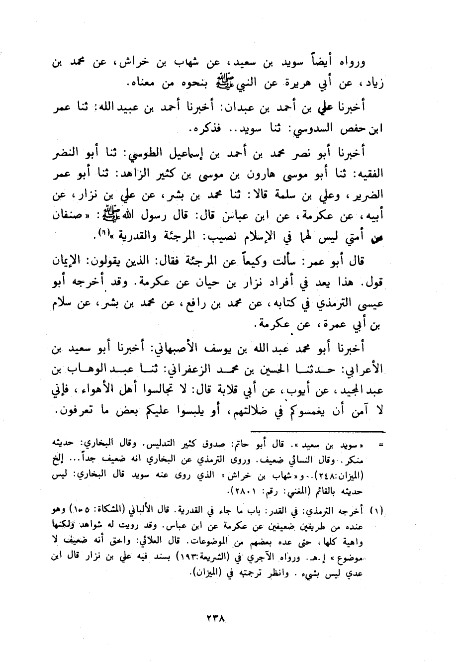 أَخْبَرَنَا أَبُو نَصْرٍ مُحَمَّدُ بْنُ أَحْمَدَ بْنِ إِسْمَاعِيلَ الطُّوسِيُّ، ثنا أَبُو النَّضْرِ الْفَقِيهُ , ثنا أَبُو مُوسَى هَارُونُ بْنُ مُوسَى بْنِ كَثِيرٍ الزَّاهِدُ، ثنا أَبُو عُمَرَ الضَّرِيرُ، وَعَلِيُّ بْنُ سَلَمَةَ، قَالَا، ثنا مُحَمَّدُ بْنُ بِشْرٍ , عَنْ عَلِيِّ بْنِ نِزَارٍ , عَنْ أَبِيهِ , عَنْ عِكْرِمَةَ , عَنِ ابْنِ عَبَّاسٍ، قَالَ: قَالَ رَسُولُ اللَّهِ صَلَّى اللهُ عَلَيْهِ وَسَلَّمَ: §صِنْفَانِ مِنْ أُمَّتِي لَيْسَ لَهُمَا فِي الْإِسْلَامِ نَصِيبٌ: الْمُرْجِئَةُ وَالْقَدَرِيَّةُ. قَالَ أَبُو عُمَرَ سَأَلْتُ وَكِيعًا عَنِ الْمُرْجِئَةِ فَقَالَ: الَّذِينَ يَقُولُونَ: الْإِيمَانُ قَوْلٌ. هَذَا يُعَدُّ فِي أَفْرَادِ نِزَارِ بْنِ حَيَّانَ، عَنْ عِكْرِمَةَ وَقَدْ أَخْرَجَهُ أَبُو عِيسَى التِّرْمِذِيُّ فِي كِتَابِهِ، عَنْ مُحَمَّدِ بْنِ رَافِعٍ، عَنْ مُحَمَّدِ بْنِ بِشْرٍ، عَنْ سَلَّامِ بْنِ أَبِي عَمْرَةَ، عَنْ عِكْرِمَةَ
