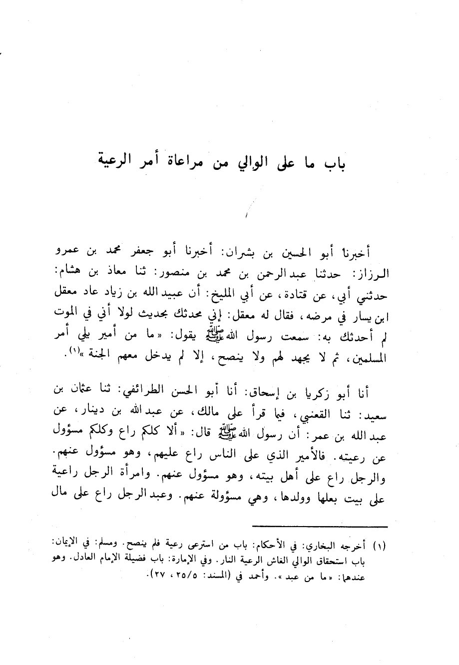 أنا أَبُو زَكَرِيَّا بْنُ إِسْحَاقَ، أنا أَبُو الْحَسَنِ الطَّرَائِفِيُّ، ثنا عُثْمَانُ بْنُ سَعِيدٍ، ثنا الْقَعْنَبِيُّ فِيمَا قَرَأَ عَلَى مَالِكٍ، عَنْ عَبْدِ اللَّهِ بْنِ دِينَارٍ، عَنْ عَبْدِ اللَّهِ بْنِ عُمَرَ أَنَّ رَسُولَ اللَّهِ صَلَّى اللهُ عَلَيْهِ وَسَلَّمَ قَالَ: أَلَا §كُلُّكُمْ رَاعٍ وَكُلُّكُمْ مَسْئُولٌ عَنْ رَعِيَّتِهِ، فَالْأَمِيرُ الَّذِي عَلَى النَّاسِ رَاعٍ عَلَيْهِمْ وَهُوَ مَسْئُولٌ عَنْهُمْ، وَالرَّجُلُ رَاعٍ عَلَى أَهْلِ بَيْتِهِ وَهُوَ مَسْئُولٌ عَنْهُمْ، وَامْرَأَةُ الرَّجُلِ رَاعِيَةٌ عَلَى بَيْتِ بَعْلِهَا وَوَلَدِهَا وَهِيَ مَسْئُولَةٌ عَنْهُمْ، وَعَبْدُ الرَّجُلِ رَاعٍ عَلَى مَالِ -[241]- سَيِّدِهِ وَهُوَ مَسْئُولٌ عَنْهُ، فَكُلُّكُمْ رَاعٍ وَكُلُّكُمْ مَسْئُولٌ عَنْ رَعِيَّتِهِ