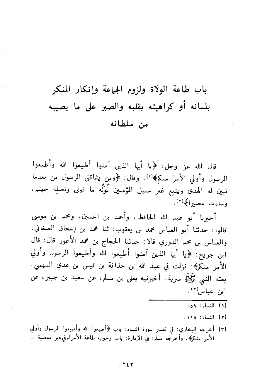 §بَابُ طَاعَةِ الْوُلَاةِ وَلُزُومُ الْجَمَاعَةِ وَإِنْكَارُ الْمُنْكِرِ بِلِسَانِهِ أَوْ كَرَاهِيَتُهُ بِقَلْبِهِ وَالصَّبْرُ عَلَى مَا يُصِيبُهُ مِنْ سُلْطَانِهِ قَالَ اللَّهُ عَزَّ وَجَلَّ {يَا أَيُّهَا الَّذِينَ آمَنُوا أَطِيعُوا اللَّهَ وَأَطِيعُوا الرَّسُولَ وَأُولِي الْأَمْرِ مِنْكُمْ} [النساء: 59] ، قَالَ: {وَمَنْ يُشَاقِقِ الرَّسُولَ مِنْ بَعْدِ مَا تَبَيَّنَ لَهُ الْهُدَى وَيَتَّبِعْ غَيْرَ سَبِيلِ الْمُؤْمِنِينَ نُوَلِّهِ مَا تَوَلَّى وَنُصْلِهِ جَهَنَّمَ وَسَاءَتْ مَصِيرًا} [النساء: 115]