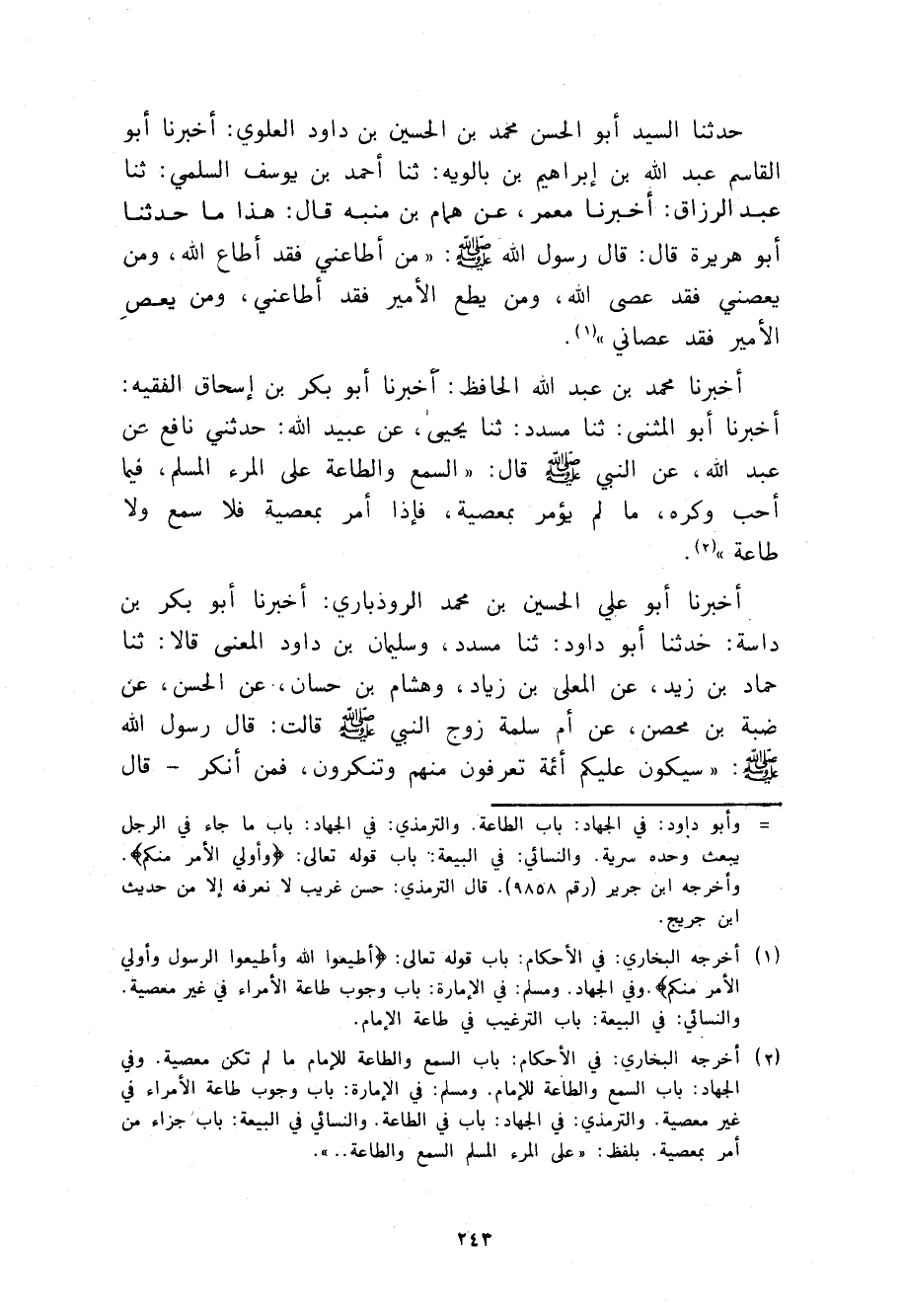 حَدَّثَنَا السَّيِّدُ أَبُو الْحَسَنِ مُحَمَّدُ بْنُ الْحُسَيْنِ بْنِ دَاوُدَ الْعَلَوِيُّ، أَخْبَرَنَا أَبُو الْقَاسِمِ عُبَيْدُ اللَّهِ بْنُ إِبْرَاهِيمَ بْنِ بَالَوَيْهِ، ثنا أَحْمَدُ بْنُ يُوسُفَ السُّلَمِيُّ، ثنا عَبْدُ الرَّزَّاقِ، أَخْبَرَنَا مَعْمَرٌ، عَنْ هَمَّامِ بْنِ مُنَبِّهٍ قَالَ: هَذَا مَا حَدَّثَنَا أَبُو هُرَيْرَةَ قَالَ: قَالَ رَسُولُ اللَّهِ صَلَّى اللهُ عَلَيْهِ وَسَلَّمَ: §مَنْ أَطَاعَنِي فَقَدْ أَطَاعَ اللَّهَ وَمَنْ يَعْصِنِي فَقَدْ عَصَى اللَّهَ , وَمَنْ يُطِعِ الْأَمِيرَ فَقَدْ أَطَاعَنِي وَمَنْ يَعْصِي الْأَمِيرَ فَقَدْ عَصَانِي