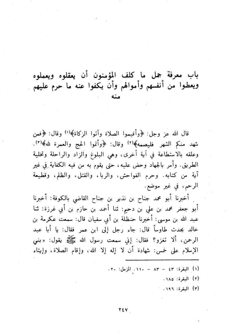 §بَابُ مَعْرِفَةِ جُمَلِ مَا كُلِّفَ الْمُؤْمِنُونَ أَنْ يَعْقِلُوهُ وَيَعْمَلُوهُ وَيُعْطُوا مِنْ أَنْفُسِهِمْ وَأَموَالِهِمْ وَأَنْ يَكُفُّوا عَنْهُ وَمَا حَرُمَ عَلَيْهِمْ مِنْهُ قَالَ اللَّهُ جَلَّ ثَنَاؤُهُ {وَأَقِيمُوا الصَّلَاةَ وَآتُوا الزَّكَاةَ} [البقرة: 43] وَقَالَ: {فَمَنْ شَهِدَ مِنْكُمُ الشَّهْرَ فَلْيَصُمْهُ} [البقرة: 185] وَقَالَ: {وَأَتِمُّوا الْحَجَّ وَالْعُمْرَةَ لِلَّهِ} [البقرة: 196] وَعلَّقَهُ بِالِاسْتِطَاعَةِ فِي آيَةٍ أُخْرَى وَهِيَ الْبُلُوغُ وَالزَّادُ وَالرَّاحِلَةُ وَتَخْلِيَةُ الطَّرِيقِ، وَأَمَرَ بِالْجِهَادِ وَحَضَّ عَلَيْهِ حَتَّى يَقُومَ بِهِ مَنْ فِيهِ الْكِفَايَةُ فِي غَيْرِ آيَةٍ مِنْ كِتَابِهِ، وَحَرَّمَ الْفَوَاحِشَ وَالرِّبَا وَالْقَتْلَ وَالظُّلْمَ وَقَطِيعَةَ الرَّحِمِ فِي غَيْرِ مَوْضِعٍ