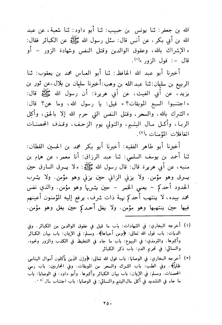 أَخْبَرَنَا أَبُو عَبْدِ اللَّهِ الْحَافِظُ , ثنا أَبُو الْعَبَّاسِ مُحَمَّدُ بْنُ يَعْقُوبَ، ثنا الرَّبِيعُ بْنُ سُلَيْمَانَ , ثنا عَبْدُ اللَّهِ بْنُ وَهْبٍ، أَخْبَرَنَا سُلَيْمَانُ بْنُ بِلَالٍ , عَنْ ثَوْرِ بْنِ زَيْدٍ , عَنْ أَبِي الْغَيْثِ , عَنْ أَبِي هُرَيْرَةَ، أَنَّ رَسُولَ اللَّهِ صَلَّى اللهُ عَلَيْهِ وَسَلَّمَ قَالَ: «§اجْتَنِبُوا السَّبْعَ الْمُوبِقَاتِ» قِيلَ: يَا رَسُولَ اللَّهِ، وَمَا هُنَّ؟ قَالَ: «الشِّرْكُ بِاللَّهِ وَالسِّحْرُ، وَقَتْلُ النَّفْسِ الَّتِي حَرَّمَ اللَّهُ إِلَّا بِالْحَقِّ، وَأَكْلُ الرِّبَا، وَأَكْلُ مَالِ الْيَتِيمِ، وَالتَّوَلِّي يَوْمَ الزَّحْفِ، وَقَذْفُ الْمُحْصَنَاتِ الْغَافِلَاتِ الْمُؤْمِنَاتِ»