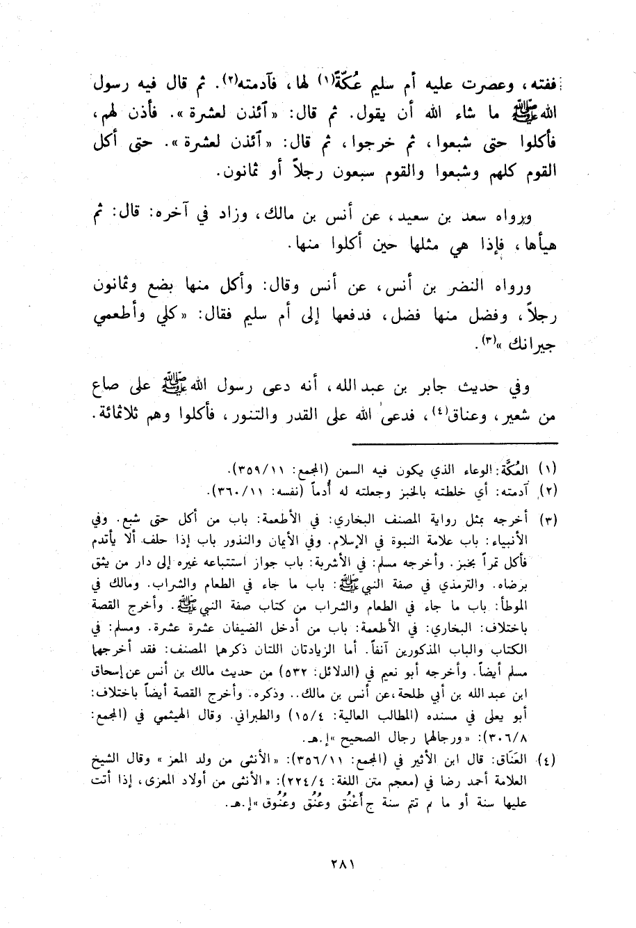 وَفِي حَدِيثِ جَابِرِ بْنِ عَبْدِ اللَّهِ أَنَّهُ دَعَا رَسُولَ اللَّهِ صَلَّى اللهُ عَلَيْهِ وَسَلَّمَ عَلَى صَاعٍ مِنْ شَعِيرٍ وَعَنَاقٍ فَدَعَا اللَّهَ عَلَى الْقِدْرِ وَالتَّنُّورِ §فَأَكَلُوا وَهُمْ ثلَاثُمِائَةٍ -[282]- قَالَ: وَأَكَلْنَا وَأَهْدَيْنَا لِجِيرَانِنَا، فَلَمَّا خَرَجَ رَسُولُ اللَّهِ صَلَّى اللهُ عَلَيْهِ وَسَلَّمَ ذَهَبَ ذَلِكَ قَالَ الشَّيْخُ: وَرُبُوُّ الطَّعَامِ بِتَبْرِيكِهِ فِيهِ حَتَّى أَكَلَ مِنْهُ عَدَدٌ كَثِيرٌ، وَزِيَادَةُ الْمَاءِ بِدُعَائِهِ قَدْ رُوِّينَاهُمَا مِنْ أَوْجُهٍ أُخْرَى. وَفِي حَدِيثِ سَمُرَةَ فِي الْقَصْعَةِ الَّتِي كَانَتْ تُمَدُّ مِنَ السَّمَاءِ وَفِي حَدِيثِ أَبِي أَيُّوبَ فِيمَا صُنِعَ مِنَ الطَّعَامِ وَفِي الشَّاةِ الَّتِي اشْتَرَاهَا مِنَ الْأَعْرَابِيِّ -[283]- وَفِي اللَّبَنِ الَّذِي دَعَا عَلَيْهِ أَهْلَ الصُّفَّةِ -[284]- وَفِيمَا خَلَفَ عَلَى عَائِشَةَ مِنَ الشَّعِيرِ وَفِيمَا أَعْطَى الرَّجُلَ مِنَ الشَّعِيرِ وَفِيمَا بَقِيَ عِنْدَ الْمَرْأَةِ مِنَ السَّمْنِ فِي الْعُكَّةِ وَغَيْرِ ذَلِكَ فِي سَائِرِ هَذِهِ الْأَحَادِيثِ وَغَيْرِهَا مِمَّا فِي مَعْنَاهَا بِأَسَانِيدِهَا مِمَّا يَطُولُ بِهِ الْكِتَابُ، وَفِيمَا أَشَرْنَا إِلَيْهِ كِفَايَةٌ وَبِاللَّهِ التَّوْفِيقُ