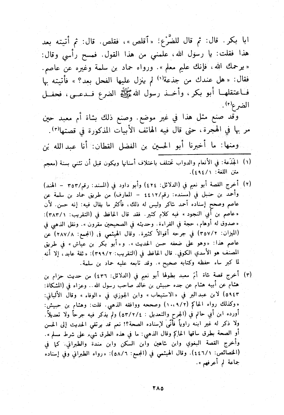 وَمِنْهَا مَا أَخْبَرَنَا أَبُو الْحُسَيْنِ بْنُ الْفَضْلِ الْقَطَّانُ , أنا عَبْدُ اللَّهِ بْنُ -[286]- جَعْفَرٍ , ثنا يَعْقُوبُ بْنُ سُفْيَانَ , ثنا عُبَيْدُ اللَّهِ بْنُ مُوسَى، وَعَبْدُ اللَّهِ بْنُ رَجَاءٍ أَبُو عَمْرٍو الْغُدَانِيُّ (ح) . وَأَخْبَرَنَا أَبُو عَبْدِ اللَّهِ الْحَافِظُ , ثنا أَبُو بَكْرِ بْنُ إِسْحَاقَ , أنا مُحَمَّدُ بْنُ سُلَيْمَانَ بْنِ الْحَارِثِ , ثنا عُبَيْدُ اللَّهِ بْنُ مُوسَى، وَعَبْدُ اللَّهِ بْنُ رَجَاءٍ، قَالَا: حَدَّثَنَا إِسْرَائِيلُ عَنْ أَبِي إِسْحَاقَ , عَنِ الْبَرَاءِ بْنِ عَازِبٍ، قَالَ: اشْتَرَى أَبُو بَكْرٍ مِنْ عَازِبٍ رَحْلًا بِثَلَاثَةَ عَشَرَ دِرْهمًا فَقَالَ أَبُو بَكْرٍ لِعَازِبٍ: مُرِ الْبَرَاءَ فَلْيَحْمِلْهُ إِلَى رَحْلِي، فَقَالَ لَهُ عَازِبٌ: لَا حَتَّى تُحَدِّثْنِي كَيْفَ صَنَعْتَ أَنْتَ وَرَسُولُ اللَّهِ صَلَّى اللهُ عَلَيْهِ وَسَلَّمَ حِينَ خَرَجْتُمَا مِنْ مَكَّةَ وَالْمُشْرِكُونَ يَطْلُبُونَكُمَا، قَالَ: أَدْلَجْنَا مِنْ مَكَّةَ لَيْلًا فَأَحْيَيْنَا لَيْلَتَنَا وَيَوْمَنَا حَتَّى أَظْهَرْنَا وَقَامَ قَائِمُ الظَّهِيرَةِ فَرَمَيْتُ بِبَصَرِي هَلْ أَرَى مِنْ ظِلٍّ نَأْوِي إِلَيْهِ فَإِذَا صَخْرَةٌ فَانْتَهَيْتُ إِلَيْهَا فَإِذَا بَقِيَّةُ ظِلٍّ لَهَا قَالَ: فَسَوَّيْتُهُ , ثُمَّ فَرَشْتُ لِرَسُولِ اللَّهِ صَلَّى اللهُ عَلَيْهِ وَسَلَّمَ فَرْوَةً ثُمَّ قُلْتُ اضْطَجِعْ يَا رَسُولَ اللَّهِ فَاضْطَجَعَ ثُمَّ ذَهَبْتُ إِلَيْهِ أَنْفُضُ مَا حَوْلِي هَلْ أَرَى مِنَ الطَّلَبِ أَحَدًا , فَإِذَا بِرَاعِي غَنَمٍ يَسُوقُ غَنَمَهُ إِلَى الصَّخْرَةِ يُرِيدُ مِنْهَا الَّذِي أُرِيدُ - يَعْنِي الظِّلَّ - فَسَأَلْتُهُ، فَقُلْتُ لَهُ: لِمَنْ أَنْتَ يَا غُلَامُ؟ فَقَالَ لِرَجُلٍ مِنْ قُرَيْشٍ , فَسَمَّاهُ , فَعَرَفْتُهُ فَقُلْتُ: هَلْ فِي غَنَمِكَ مِنْ لَبَنٍ؟ قَالَ: نَعَمْ، قُلْتُ: هَلْ أَنْتَ حَالِبٌ لِي؟ قَالَ: نَعَمْ، فَأَمَرْتُهُ , فَاعْتَقَلَ شَاةً مِنْ غَنَمِهِ وَأَمَرْتُهُ أَنْ يَنْفُضَ ضَرْعَهَا مِنَ التُّرَابِ , ثُمَّ أَمَرْتُهُ أَنْ يَنْفُضَ كَفَّيْهِ، فَقَالَ: هَكَذَا , فَضَرَبَ إِحْدَى كَفَّيْهِ عَلَى الْأُخْرَى , فَحَلَبَ لِي كُثْبَةً مِنْ لَبَنٍ وَقَدْ رَوَّيْتُ مَعِي لِرَسُولِ اللَّهِ صَلَّى اللهُ عَلَيْهِ وَسَلَّمَ إِدَاوَةً عَلَى فَمِهَا خِرْقَةٌ , فَصَبَبْتُ عَلَى اللَّبَنِ حَتَّى بَرَدَ أَسْفَلُهُ , فَأَتَيْتُ رَسُولَ اللَّهِ صَلَّى اللهُ عَلَيْهِ وَسَلَّمَ , فَوَافَقْتُهُ وَقَدِ اسْتَيْقَظَ فَقُلْتُ: §اشْرَبْ يَا رَسُولَ اللَّهِ صَلَّى اللهُ عَلَيْهِ وَسَلَّمَ , فَشَرِبَ حَتَّى رَضِيتُ , ثُمَّ قُلْتُ: قَدْ آنَ الرَّحِيلُ يَا رَسُولَ اللَّهِ، قَالَ: فَارْتَحَلْنَا وَالْقَوْمُ يَطْلُبُونَنَا فَلَمْ يُدْرِكْنَا أَحَدٌ مِنْهُمْ غَيْرُ سُرَاقَةَ بْنِ -[287]- مَالِكِ بْنِ جُعْشُمٍ عَلَى فَرَسٍ لَهُ فَقُلْتُ: هَذَا الطَّلَبُ لَقَدْ لَحِقَنَا يَا رَسُولَ اللَّهِ، قَالَ: «لَا تَحْزَنْ إِنَّ اللَّهَ مَعَنَا» ، فَلَمَّا دَنَا مِنَّا وَكَانَ بَيْنَنَا وَبَيْنَهُ قِيدَ رُمْحيْنِ أَوْ ثَلَاثَةٍ قُلْتُ: هَذَا الطَّلَبُ قَدْ لَحِقَنَا يَا رَسُولَ اللَّهِ، وَبَكَيْتُ، فَقَالَ: «مَا يُبْكِيكَ» ؟ فَقُلْتُ: أَمَا وَاللَّهِ مَا عَلَى نَفْسِي أَبْكِي وَلكِنَّنِي إِنَّمَا أَبْكِي عَلَيْكَ، قَالَ: فَدَعَا عَلَيْهِ رَسُولُ اللَّهِ صَلَّى اللهُ عَلَيْهِ وَسَلَّمَ فَقَالَ: «اللَّهُمُ اكْفِنَاهُ بِمَا شِئْتَ» ، قَالَ فَسَاخَتْ بِهِ فَرَسُهُ فِي الْأَرْضِ إِلَى بَطْنِهَا فَوَثَبَ عَنْهَا , ثُمَّ قَالَ: يَا مُحَمَّدُ، قَدْ عَلِمْتُ أَنَّ هَذَا عَمَلُكَ فَادْعُ اللَّهَ أَنْ يُنْجِيَنِي مِمَّا أَنَا فِيهِ؛ فَوَاللَّهِ لَأُعَمِّيَنَّ عَلَى مَنْ وَرَائِي مِن