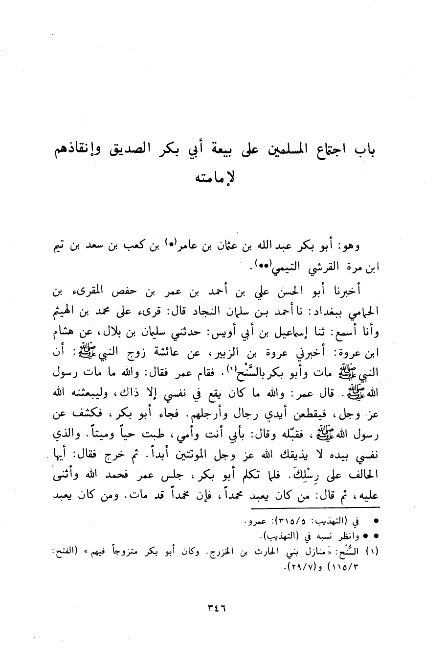 أَخْبَرَنَا أَبُو الْحَسَنِ عَلِيُّ بْنُ أَحْمَدَ بْنِ عُمَرَ بْنِ حَفْصٍ الْمُقْرِئُ بْنُ الْحِمَامِيِّ بِبَغْدَادَ، نا أَحْمَدُ بْنُ سَلْمَانَ النَّجَّادُ قَالَ: قُرِئَ عَلَى مُحَمَّدِ بْنِ الْهَيْثَمِ وَأَنَا أَسْمعُ، ثنا إِسْمَاعِيلُ بْنُ أَبِي أُوَيْسٍ، حَدَّثَنِي سُلَيْمَانُ بْنُ بِلَالٍ، عَنْ هِشَامِ بْنِ عُرْوَةَ، أَخْبرَنِي عُرْوَةُ بْنُ الزُّبَيْرِ، عَنْ عَائِشَةَ زَوْجِ النَّبِيِّ صَلَّى اللهُ عَلَيْهِ وَسَلَّمَ أَنَّ النَّبِيَّ صَلَّى اللهُ عَلَيْهِ وَسَلَّمَ مَاتَ وَأَبُو بَكْرٍ بِالسُّنْحِ فَقَامَ عُمَرُ فَقَالَ: وَاللَّهِ مَا مَاتَ رَسُولُ اللَّهِ صَلَّى اللهُ عَلَيْهِ وَسَلَّمَ، قَالَ عُمَرُ: وَاللَّهِ مَا كَانَ يَقَعُ فِي نَفْسِي إِلَّا ذَاكَ وَلَيَبْعَثَنَّهُ اللَّهُ عَزَّ وَجَلَّ فَيُقَطِعَنَّ أَيْدِيَ رِجَالٍ وَأَرْجُلَهُمْ، فَجَاءَ أَبُو بَكْرٍ فَكَشَفَ عَنْ رَسُولِ اللَّهِ صَلَّى اللهُ عَلَيْهِ وَسَلَّمَ فَقَبَّلَهُ وَقَالَ: بأَبِي أَنْتَ وَأُمِّي طِبْتَ حَيًّا وَمَيِّتًا، وَالَّذِي نَفْسِي بِيَدِهِ لَا يُذِيقُكَ اللَّهُ عَزَّ وَجَلَّ الْمَوْتَتَيْنِ أَبَدًا، ثُمَّ خَرَجَ فَقَالَ: أَيُّهَا الْحَالِفُ عَلَى رِسْلَكَ فَلَمَّا تَكَلَّمَ أَبُو بَكْرٍ جَلَسَ عُمَرُ فَحَمِدَ اللَّهَ وَأَثْنَى عَلَيْهِ ثُمَّ قَالَ: §مَنْ كَانَ يَعْبُدُ مُحَمَّدًا فَإِنَّ مُحَمَّدًا قَدْ مَاتَ، وَمَنْ كَانَ يَعْبُدُ -[347]- اللَّهَ فَإِنَّ اللَّهَ حَيٌّ لَا يَمُوتُ وَقَالَ: {إِنَّكَ مَيِّتٌ وَإِنَّهُمْ مَيِّتونَ} [الزمر: 30] وَقَالَ: {وَمَا مُحَمَّدٌ إِلَّا رَسُولٌ قَدْ خَلَتْ مِنْ قَبْلِهِ الرُّسُلُ أَفَإِنْ مَاتَ أَوْ قُتِلَ انْقَلَبْتُمْ عَلَى أَعْقَابِكُمْ} [آل عمران: 144] الْآيَةُ كُلُّهَا، فَنَشَجَ النَّاسُ يبْكونَ، وَاجْتَمَعَتِ الْأَنْصَارُ إِلَى سَعْدِ بْنِ عُبَادَةَ فِي سَقِيفَةِ بَنِي سَاعِدَةَ فَقَالُوا: مِنَّا أَمِيرٌ وَمِنْكُمْ أَمِيرٌ، فَذَهَبَ إِلَيْهِمْ أَبُو بَكْرٍ وَعُمَرُ وَأَبُو عُبَيْدَةَ بْنُ الْجَرَّاحِ فَذَهَبَ عُمَرُ يَتَكَلَّمُ فَأَسْكَتَهُ أَبُو بَكْرٍ وَكَانَ عُمَرُ يَقُولُ: وَاللَّهِ مَا أَرَدْتُ بِذَلِكَ إِلَّا أَنِّي قَدْ هَيَأْتُ كَلَامًا أَعْجَبَنِي فَخَشِيتُ أَنْ لَا يُبَلِّغَهُ أَبُو بَكْرٍ فَتَكَلَّمَ وَأَبْلَغَ، وَقَالَ فِي كَلَامِهِ: نَحْنُ الْأُمَرَاءُ وَأَنْتُمُ الْوُزَرَاءُ، قَالَ الْحُبَابُ بْنُ الْمُنْذِرِ: لَا وَاللَّهِ لَا نَفْعلُ أَبَدًا مِنَّا أَمِيرٌ وَمِنْكُمْ أَمِيرٌ، فَقَالَ أَبُو بَكْرٍ: لَا وَلَكِنَّا الْأُمَرَاءُ وَأَنْتُمُ الْوُزَرَاءُ - يَعْنِي الْمُهَاجِرِينَ هُمْ أَوْسطُ الْعَرَبِ دَارًا وَأَعَزُّهُمْ أَحْسَابًا - فَبَايِعُوا عُمَرَ بْنَ الْخَطَّابِ أَوْ أَبَا عُبَيْدَةَ بْنَ الْجَرَّاحِ، فَقَالَ عُمَرُ: بَلْ نبَايِعُكَ أَنْتَ خَيْرُنَا وَسيِّدُنَا وَأَحَبُّ إِلَى رَسُولِ اللَّهِ صَلَّى اللهُ عَلَيْهِ وَسَلَّمَ، وَأَخَذَ عُمَرُ بِيَدِهِ فَبَايَعَهُ وَبَايَعَهُ النَّاسُ، فَقَالَ قَائِلٌ: قَتَلْتُمْ سَعْدَ بْنَ عُبَادَةَ، فَقَالَ عُمَرُ: قَتَلَهُ اللَّهُ. وَرَوَاهُ عَبْدُ اللَّهِ بْنُ عَبَّاسٍ، عَنْ عُمَرَ بْنِ الْخَطَّابِ فِي قِصَّةِ السِّقِيفَةِ بِمَعْنَى مَا رَوَتْهُ عَائِشَةُ وَفيهُ مِنَ الزِّيَادَةِ عَنْ عُمَرَ قَالَ: فَلَمْ أَكْرَهْ مِمَّا قَالَ غَيْرَهَا، كَانَ وَاللَّهِ أَنْ أُقْدِمَ فَتُضْربَ عُنُقِي لَا يُقَرِّبُنِي ذَلِكَ إِلَى إِثْمٍ أَحَبَّ إِلَيَّ مِنْ أَنْ -[348]- أُؤَمَّرَ عَلَى قَوْمٍ فِيهِمْ أَبُو بَكْرٍ، وَزَادَ أَيْضًا قَالَ عُمَرُ: فَكَثُرَ اللَّغَطُ وَارْتَفَعَتِ الْأَصْوَاتُ حَتَّى أَشْفَقْتُ الِاخْتِلَافَ فَقُلْتُ: ابْسُطْ يَدَكَ يَا أَبَا بَكْرٍ، فَبَسَطَ أَبُو بَكْرٍ يَدَهُ فَبَايَعَ