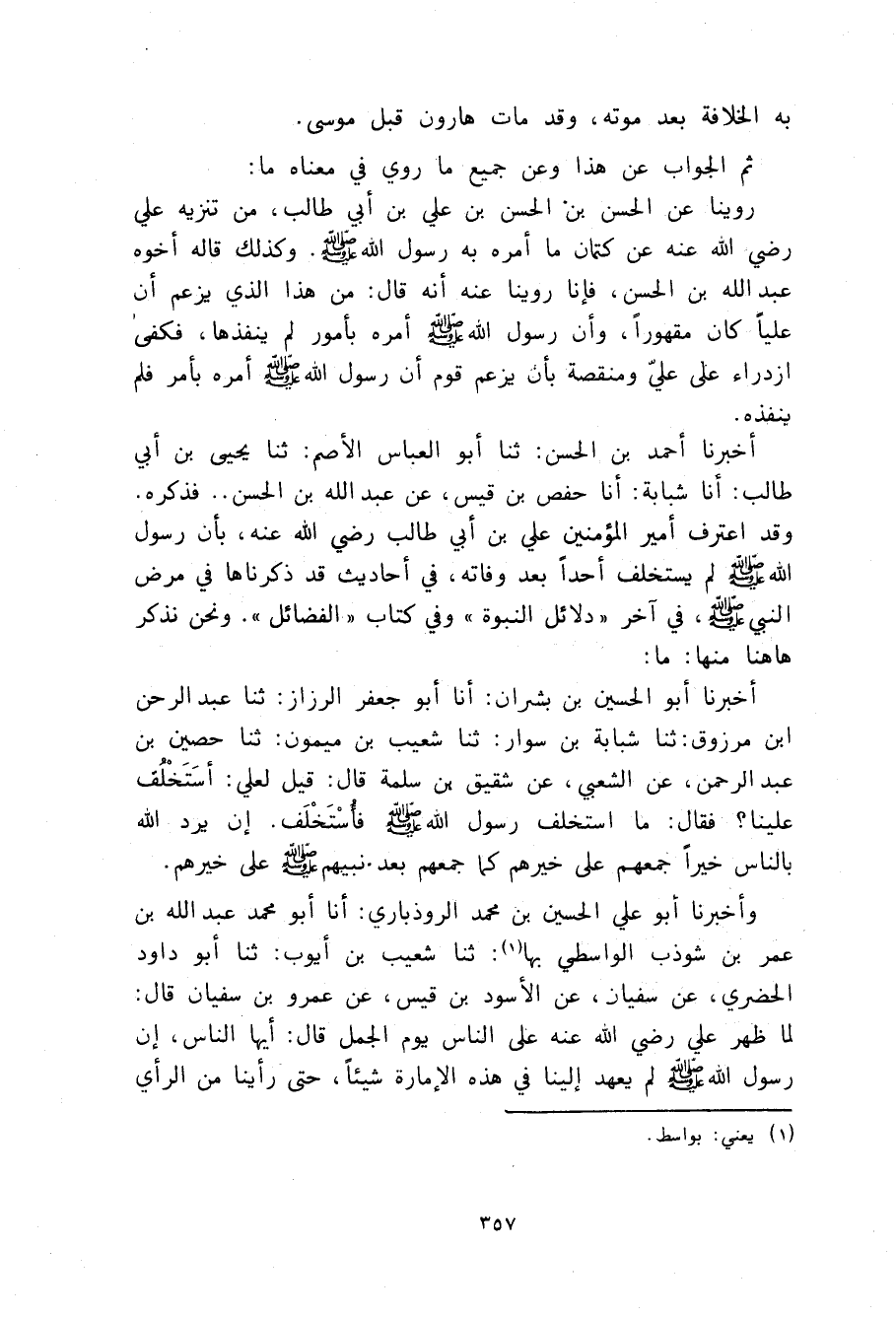 مِنْهَا مَا أَخْبَرَنَا أَبُو الْحُسَيْنِ بْنُ بِشْرَانَ، أنا أَبُو جَعْفَرٍ الرَّزَّازُ، ثنا عَبْدُ الرَّحْمَنِ بْنُ مَرْزُوقٍ، ثنا شَبَابَةُ بْنُ سِوَارٍ، ثنا شُعَيْبُ بْنُ مَيْمُونٍ، ثنا حُصَيْنُ بْنُ عَبْدِ الرَّحْمَنِ، عَنِ الشَّعْبِيِّ، عَنْ شَقِيقِ بْنِ سَلَمَةَ قَالَ: قِيلَ لِعَلِيٍّ: اسْتَخْلِفْ عَلَيْنَا، فَقَالَ: §مَا اسْتَخْلَفَ رَسُولُ اللَّهِ صَلَّى اللهُ عَلَيْهِ وَسَلَّمَ فَأَسْتَخْلِفَ، وَلَكِنْ إِنْ يُرِدِ اللَّهُ بِالنَّاسِ خُيْرًا جَمَعَهُمْ عَلَى خَيْرِهِمْ كَمَا جَمَعَهُمْ بَعْدَ نَبِيِّهِمْ صَلَّى اللهُ عَلَيْهِ وَسَلَّمَ عَلَى خَيْرِهِمْ