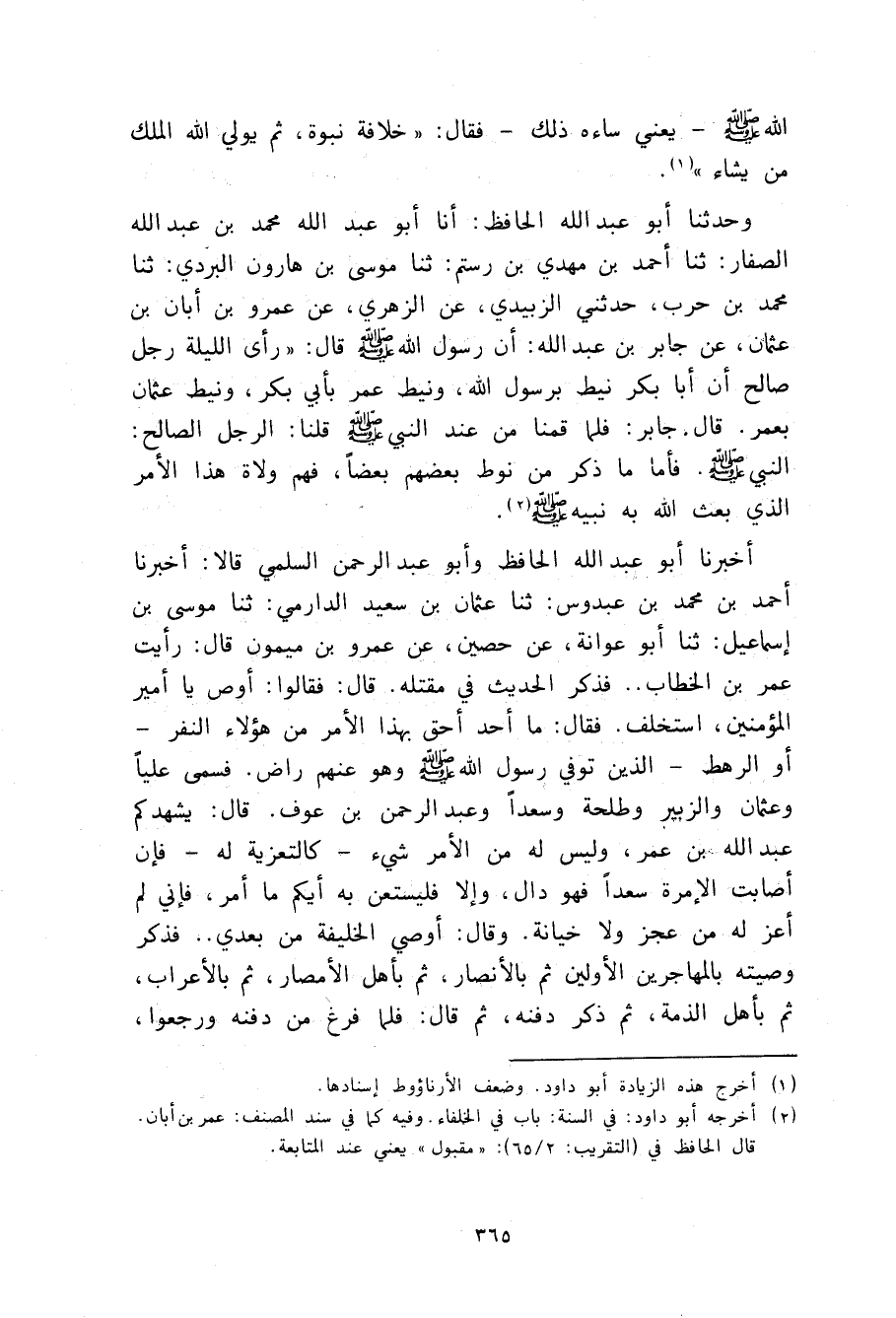 وَحَدَّثَنَا أَبُو عَبْدِ اللَّهِ الْحَافِظُ , أنا أَبُو عَبْدِ اللَّهِ مُحَمَّدُ بْنُ عَبْدِ اللَّهِ الصَّفَّارُ، ثنا أَحْمَدُ بْنُ مَهْدِيِّ بْنِ رُسْتُمَ , ثنا مُوسَى بْنُ هَارُونَ الْبَرْدِيُّ , ثنا مُحَمَّدُ بْنُ حَرْبٍ , حَدَّثَنِي الزُّبَيْدِيُّ , عَنِ الزُّهْرِيِّ , عَنْ عَمْرِو بْنِ أَبَانَ بْنِ عُثْمَانَ , عَنْ جَابِرِ بْنِ عَبْدِ اللَّهِ، أَنَّ رَسُولَ اللَّهِ صَلَّى اللهُ عَلَيْهِ وَسَلَّمَ قَالَ: رَأَى اللَّيْلَةَ رَجُلٌ صَالِحٌ أَنَّ §أَبَا بَكْرٍ نِيطَ برَسُولِ اللَّهِ وَنِيطَ عُمَرُ بأَبِي بَكْرٍ وَنِيطَ عُثْمَانُ بعُمَرَ، قَالَ جَابِرٌ: فَلَمَّا قُمنَا مِنْ عِنْدِ النَّبِيِّ صَلَّى اللهُ عَلَيْهِ وَسَلَّمَ قُلْنَا: الرَّجُلُ الصَّالِحُ النَّبِيُّ صَلَّى اللهُ عَلَيْهِ وَسَلَّمَ، فَأَمَّا مَا ذُكِرَ مِنْ نَوْطِ بَعْضِهِمْ بَعْضًا فَهُمْ وُلَاةِ هَذَا الْأَمْرِ الَّذِي بَعَثَ اللَّهُ بِهِ نَبِيَّهُ صَلَّى اللهُ عَلَيْهِ وَسَلَّمَ