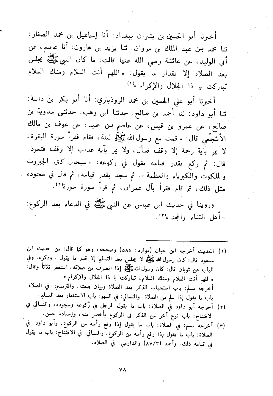أَخْبَرَنَا أَبُو عَلِيٍّ الْحُسَيْنُ بْنُ مُحَمَّدٍ الرُّوذْبَارِيُّ، أنا أَبُو بَكْرِ بْنُ دَاسَةَ، ثنا أَبُو دَاوُدَ، ثنا أَحْمَدُ بْنُ صَالِحٍ، حَدَّثَنَا ابْنُ وَهْبٍ، حَدَّثَنِي مُعَاوِيَةُ بْنُ صَالِحٍ، عَنْ عمْرِو بْنِ قَيْسٍ، عَنْ عَاصِمِ بْنِ حُمَيْدٍ، عَنْ عَوْفِ بْنِ مَالِكٍ الْأَشْجَعِيِّ، قَالَ: قُمْتُ مَعَ رَسُولِ اللَّهِ صَلَّى اللهُ عَلَيْهِ وَسَلَّمَ لَيْلَةً، فَقَامَ §فَقَرَأَ سُورَةَ الْبَقَرَةِ، لَا يَمُرُّ بِآيَةِ رَحْمَةٍ إِلَّا وَقَفَ فَسَأَلَ، وَلَا يَمُرُّ بِآيَةِ عَذَابٍ إِلَّا وَقَفَ فَتَعَوَّذَ. قَالَ: ثُمَّ رَكَعَ بِقَدْرِ قِيَامِهِ يَقُولُ فِي رُكُوعِهِ: سُبْحَانَ ذِي الْجَبَرُوتِ وَالْمَلَكُوتِ وَالْكِبْرِيَاءِ وَالْعَظَمَةِ، ثُمَّ سَجَدَ بِقَدْرِ قِيَامِهِ، ثُمَّ قَالَ فِي سُجُودِهِ مِثْلَ ذَلِكَ، ثُمَّ قَامَ فَقَرَأَ بِآلِ عِمْرَانَ، ثُمَّ قَرَأَ سُورَةً سُورَةً وَرُوِّينَا فِي حَدِيثِ ابْنِ عَبَّاسٍ عَنِ النَّبِيِّ صَلَّى اللهُ عَلَيْهِ وَسَلَّمَ فِي الدُّعَاءِ بَعْدَ الرُّكُوعِ: أَهْلَ الثَّنَاءِ وَالْمَجْدِ -[79]-. قَالَ الشَّيْخُ رَحِمَهُ اللَّهُ: وَهَذِهِ الصِّفَاتُ مِنْ كَمَالِ أَوْصَافِ الْإِلَهِيَّةِ، فَوَجَبَ إِثْبَاتُ كُلِّ مَدْحٍ لَهُ، وَنَفْيُ كُلِّ نَقْصٍ عَنْهُ