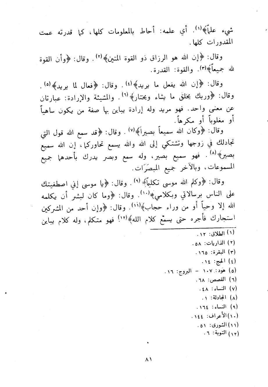 : 12] ، أَيْ عِلْمُهُ أَحَاطَ بِالْمَعْلُومَاتِ كُلِّهَا كَمَا قُدْرَتُهُ عَمَّتِ الْمَقْدُورَاتِ كُلَّهَا، وَقَالَ: {إِنَّ اللَّهَ هُوَ الرَّزَّاقُ ذُو الْقُوَّةِ الْمَتِينُ} [الذاريات: 58] ، وَقَالَ: {أَنَّ الْقُوَّةَ لِلَّهِ جَمِيعًا} [البقرة: 165] ، وَالْقُوَّةُ: الْقُدْرَةُ، وَقَالَ: {إِنَّ اللَّهَ يَفْعَلُ مَا يُرِيدُ} [الحج: 14] ، وَقَالَ: {فَعَّالٌ لِمَا يُرِيدُ} [هود: 107] ، وَقَالَ: {وَرَبُّكَ يَخْلُقُ مَا يَشَاءُ وَيَخْتَارُ} [القصص: 68] ، وَالْمَشِيئَةُ وَالْإِرَادَةُ عِبَارَتَانِ عَنْ مَعْنًى وَاحِدٍ، فَهُوَ مُرِيدٌ، وَلَهُ إِرَادَةٌ يُبَايِنُ بِهَا صِفَةَ مَنْ يَكُونُ سَاهِيًا أَوْ مَغْلُوبًا أَوْ مُكْرَهًا، وَقَالَ: {وَكَانَ اللَّهُ سَمِيعًا بَصِيرًا} [النساء: 134] ، وَقَالَ: {قَدْ سَمِعَ اللَّهُ قَوْلَ الَّتِي تُجَادِلُكَ فِي زَوْجِهَا وَتَشْتَكِي إِلَى اللَّهِ وَاللَّهُ يَسْمَعُ تَحَاوُرَكُمَا إِنَّ اللَّهَ سَمِيعٌ بَصِيرٌ} [المجادلة: 1] ، فَهُوَ سَمِيعٌ بَصِيرٌ، وَلَهُ سَمْعٌ وَبَصَرٌ يُدْرِكُ بِأَحَدِهِمَا جَمِيعَ الْمَسْمُوعَاتِ، وَبَالْآخَرِ جَمِيعَ الْمُبْصَرَاتِ، وَقَالَ: {وَكَلَّمَ اللَّهُ مُوسَى تَكْلِيمًا} [النساء: 164] ، وَقَالَ: {يَا مُوسَى إِنِّي اصْطَفَيْتُكَ عَلَى النَّاسِ بِرِسَالَاتِي وَبِكَلَامِي} [الأعراف: 144] ، وَقَالَ: {وَمَا كَانَ لِبَشَرٍ أَنْ يُكَلِّمَهُ اللَّهُ إِلَّا وَحْيًا أَوْ مِنْ وَرَاءِ حِجَابٍ} [الشورى: 51] ، وَقَالَ: {وَإِنْ أَحَدٌ مِنَ الْمُشْرِكِينَ استَجَارَكَ فَأَجِرْهُ حَتَّى يَسْمَعَ كَلَامَ اللَّهِ} [التوبة: 6] ، فَهُوَ مُتَكَلِّمٌ، وَلَهُ كَلَامٌ يُبَايِنُ