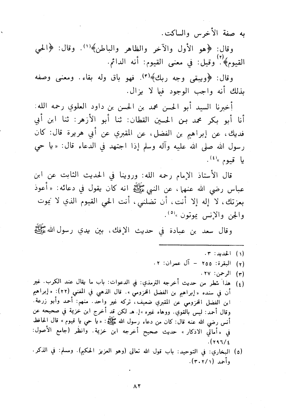 أَخْبَرَنَا السَّيِّدُ أَبُو الْحَسَنِ مُحَمَّدُ بْنُ الْحُسَيْنِ بْنِ دَاوُدَ الْعَلَوِيُّ رَحِمَهُ اللَّهُ، أنا أَبُو بَكْرٍ مُحَمَّدُ بْنُ الْحُسَيْنِ الْقَطَّانُ، ثنا أَبُو الْأَزْهَرِ، ثنا ابْنُ أَبِي فُدَيْكٍ، عَنْ إِبْرَاهِيمَ بْنِ الْفَضْلِ، عَنِ الْمَقْبُرِيِّ، عَنْ أَبِي هُرَيْرَةَ، قَالَ: كَانَ رَسُولُ اللَّهِ صَلَّى اللهُ عَلَيْهِ وَسَلَّمَ إِذَا اجْتَهَدَ فِي الدُّعَاءِ قَالَ: §«يَا حِيُّ يَا قيُّومُ» قَالَ الْأُسْتَاذُ الْإِمَامُ رَحِمَهُ اللَّهُ: وَرُوِّينَا فِي الْحَدِيثِ الثَّابِتِ عَنِ ابْنِ عَبَّاسٍ رَضِيَ اللَّهُ عَنْهُمَا، عَنِ النَّبِيِّ صَلَّى اللهُ عَلَيْهِ وَسَلَّمَ أَنَّهُ كَانَ يَقُولُ فِي دُعَائِهِ: «أَعُوذُ بعِزَّتِكَ، لَا إِلَهَ إِلَّا أَنْتَ، أَنْ تُضِلَّنِي، أَنْتَ الْحَيُّ الْقَيُّومُ الَّذِي لَا يَمُوتُ وَالْجِنُّ وَالْإِنْسُ يَمُوتُونَ» . وَقَالَ سَعْدُ بْنُ عُبَادَةَ فِي حَدِيثِ الْإِفْكِ بَيْنَ يَدَيْ رَسُولِ اللَّهِ صَلَّى اللهُ عَلَيْهِ وَسَلَّمَ -[83]- لِسَعْدِ بْنِ مُعَاذٍ: لَعَمْرُ اللَّهِ لَا تَقْتُلُهُ. وَقَالَ أُسَيْدُ بْنُ حُضَيْرٍ: لَعَمْرُ اللَّهِ لَنَقْتُلَنَّهُ. فَحَلَفَ كُلُّ وَاحِدٍ مِنْهُمَا بِحَيَاةِ اللَّهِ وَبِبَقَائِهِ، وَالنَّبِيُّ صَلَّى اللهُ عَلَيْهِ وَسَلَّمَ يَسْمَعُ