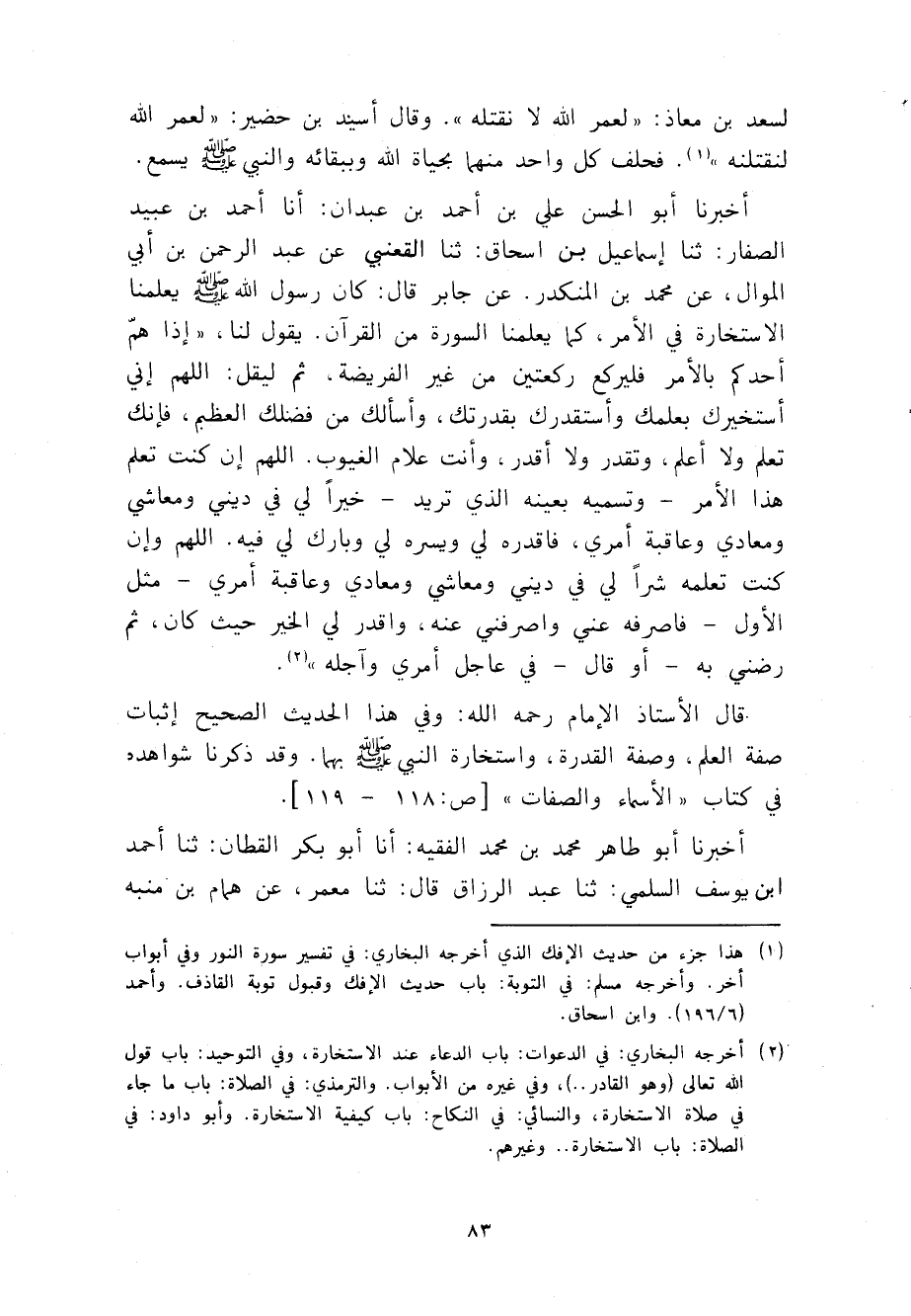 أَخْبَرَنَا أَبُو الْحَسَنِ عَلِيُّ بْنُ أَحْمَدَ بْنِ عَبْدَانَ، أنا أَحْمَدُ بْنُ عُبَيْدٍ الصَّفَّارُ، ثنا إِسْمَاعِيلُ بْنُ إِسْحَاقَ، ثنا الْقَعْنَبِيُّ، عَنْ عَبْدِ الرَّحْمَنِ بْنِ أَبِي الْمَوَّالِ، عَنْ مُحَمَّدِ بْنِ الْمُنْكَدِرِ، عَنْ جَابِرٍ، قَالَ: كَانَ رَسُولُ اللَّهِ صَلَّى اللهُ عَلَيْهِ وَسَلَّمَ يُعَلِّمُنَا الِاسْتِخَارَةَ فِي الْأَمْرِ كَمَا يُعَلِّمُنَا السُّورَةَ مِنَ الْقُرْآنِ، يَقُولُ لَنَا: §" إِذَا هَمَّ أَحَدُكُمْ بِالْأَمْرِ فَلْيَرْكَعْ رَكْعَتَيْنِ مِنْ غَيْرِ الْفَرِيضَةِ، ثُمَّ لِيَقُلِ: اللَّهُمَّ إِنِّي أَسْتَخِيرُكَ بِعِلْمِكَ، وَأَسْتَقْدِرُكَ بِقُدْرَتِكَ، وَأَسْأَلُكَ مِنْ فَضْلِكَ الْعَظِيمِ؛ فَإِنَّكَ تَعْلَمُ وَلَا أَعْلَمُ، وَتَقْدِرُ وَلَا أَقْدِرُ، وَأَنْتَ عَلَّامُ الْغُيُوبِ، اللَّهُمَّ فَإِنْ كُنْتَ تَعْلَمُ أَنَّ هَذَا الْأَمْرَ وَتُسَمِّيهِ بِعَيْنِهِ الَّذِي تُرِيدُ خَيْرًا لِي فِي دِينِي وَمَعَاشِي وَمَعَادِي وَعَاقِبَةِ أَمْرِي، فَاقْدُرْهُ لِي وَيَسِّرْهُ لِي وَبَارِكْ لِي فِيهِ، اللَّهُمَّ وَإِنْ كُنْتَ تَعْلَمُهُ شَرًّا لِي فِي دِينِي وَمَعَاشِي وَمَعَادِي وَعَاقِبَةِ أَمْرِي مِثْلَ الْأَوَّلِ فَاصْرِفْهُ عَنِّي وَاصْرِفْنِي عَنْهُ وَاقْدُرْ لِيَ الْخَيْرَ حَيْثُ كَانَ، ثُمَّ رَضِّنِي بِهِ "، أَوْ قَالَ: «فِي عَاجِلِ أَمْرِي وَآجِلِهِ» . قَالَ الْأُسْتَاذُ الْإِمَامُ رَحِمَهُ اللَّهُ: وَفِي هَذَا الْحَدِيثِ الصَّحِيحِ إِثْبَاتُ صِفَةِ الْعِلْمِ وَصِفَةِ الْقُدْرَةِ وَاسْتِخَارَةِ النَّبِيِّ صَلَّى اللهُ عَلَيْهِ وَسَلَّمَ بِهِمَا، وَقَدْ ذَكَرْنَا شَوَاهِدَهُ فِي كِتَابِ الْأَسْمَاءِ وَالصِّفَاتِ
