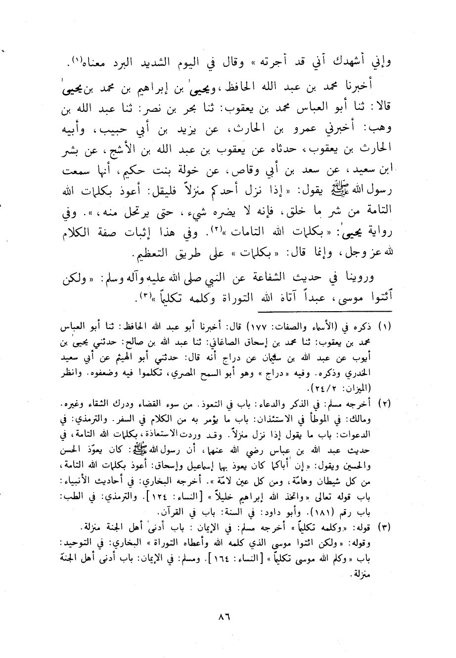 أَخْبَرَنَا مُحَمَّدُ بْنُ عَبْدِ اللَّهِ الْحَافِظُ، وَيَحْيَى بْنُ إِبْرَاهِيمَ بْنِ مُحَمَّدِ بْنِ يَحْيَى، قَالَا: ثنا أَبُو الْعَبَّاسِ مُحَمَّدُ بْنُ يَعْقُوبَ، ثنا بَحْرُ بْنُ نَصْرٍ، ثنا عَبْدُ اللَّهِ بْنُ وَهْبٍ، أَخبَرَنِي عَمْرُو بْنُ الْحَارِثِ، عَنْ يَزِيدَ بْنِ أَبِي حَبِيبٍ، وَأَبِيهِ الْحَارِثِ بْنِ يَعْقُوبَ، حَدَّثَاهُ، عَنْ يَعْقُوبَ بْنِ عَبْدِ اللَّهِ بْنِ الْأَشَجِّ، عَنْ بِشْرِ بْنِ سَعِيدٍ، عَنْ سَعْدِ بْنِ أَبِي وَقَّاصٍ، عَنْ خَوْلَةَ بِنْتِ حَكِيمٍ، أَنَّهَا سَمِعَتْ رَسُولَ اللَّهِ صَلَّى اللهُ عَلَيْهِ وَسَلَّمَ يَقُولُ: " §إِذَا نَزَلَ أَحَدُكُمْ مَنْزِلًا فَلْيَقُلْ: أَعُوذُ بِكَلِمَاتِ اللَّهِ التَّامَّةِ مِنْ شَرِّ مَا خَلَقَ؛ فَإِنَّهُ لَا يَضُرُّهُ شَيْءٌ حَتَّى يَرْتَحِلَ مِنْهُ " وَفِي رِوَايَةِ يَحْيَى: «بِكَلِمَاتِ اللَّهِ التَّامَّاتِ» . وَفِي هَذَا إِثْبَاتُ صِفَةِ الْكَلَامِ لِلَّهِ عَزَّ وَجَلَّ، وَإِنَّمَا قَالَ بِكَلِمَاتٍ عَلَى طَرِيقِ التَّعْظِيمِ. وَرُوِّينَا فِي حَدِيثِ الشَّفَاعَةِ، عَنِ النَّبِيِّ صَلَّى اللهُ عَلَيْهِ وَسَلَّمَ: «وَلَكِنِ ائْتُوا مُوسَى عَبْدًا آتَاهُ اللَّهُ التَّوْرَاةَ وَكَلَّمَهُ تَكْلِيمًا» -[87]-. وَفِي حَدِيثِ عَدِيِّ بْنِ حَاتِمٍ، عَنِ النَّبِيِّ صَلَّى اللهُ عَلَيْهِ وَسَلَّمَ: «مَا مِنْكُمْ مِنْ أَحَدٍ إِلَّا سيُكَلِّمُهُ ربُّهُ لَيْسَ بَيْنَهُ وَبَيْنَهُ حَاجِبٌ وَلَا تَرْجُمَانٌ» أَخْبَرَنَا أَبُو الْحُسَيْنِ بْنُ بِشْرَانَ، أنا أَبُو جَعْفَرٍ الرَّزَّازُ، ثنا عَبْدُ اللَّهِ بْنُ مُحَمَّدِ بْنِ شَاكِرٍ، ثنا أَبُو أُسَامَةَ، ثنا الْأَعْمَشُ، عَنْ خَيْثَمَةَ بْنِ عَبْدِ الرَّحْمَنِ، عَنْ عَدِيِّ بْنِ حَاتِمٍ قَالَ: قَالَ رَسُولُ اللَّهِ صَلَّى اللهُ عَلَيْهِ وَسَلَّمَ، فَذَكَرهُ