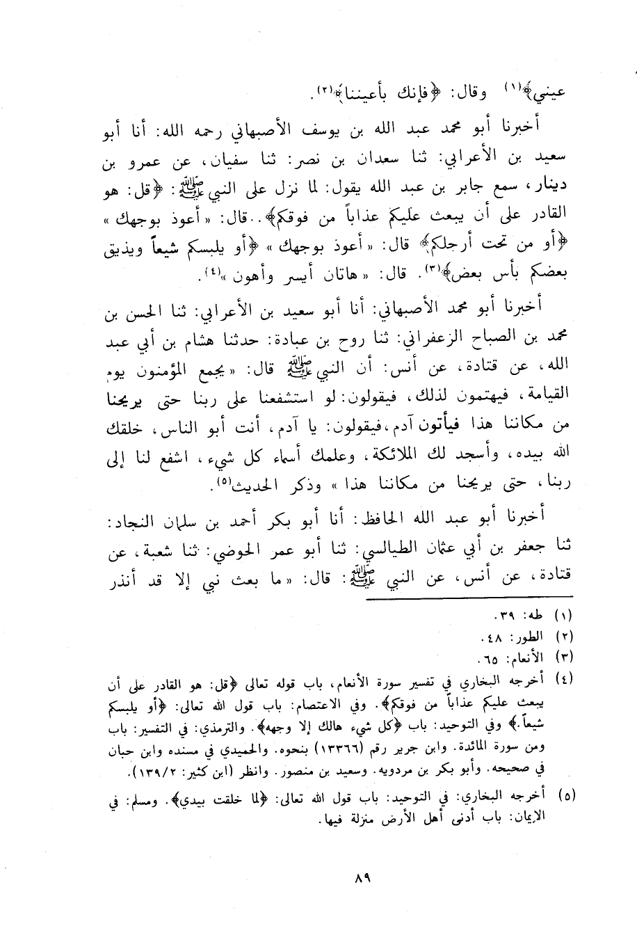 أَخْبَرَنَا أَبُو مُحَمَّدٍ عَبْدُ اللَّهِ بْنُ يُوسُفَ الْأَصْبَهَانِيُّ، رَحِمَهُ اللَّهُ، أنا أَبُو سَعِيدِ بْنُ الْأَعْرَابِيِّ، ثنا سَعْدَانُ بْنُ نَصْرٍ، ثنا سُفْيَانُ، عَنْ عَمْرِو بْنِ دِينَارٍ، سَمِعَ جَابِرَ بْنَ عَبْدِ اللَّهِ، يَقُولُ: لَمَّا نَزَلَ عَلَى النَّبِيِّ صَلَّى اللهُ عَلَيْهِ وَسَلَّمَ {قُلْ هُوَ الْقَادِرُ عَلَى أَنْ يَبْعَثَ عَلَيْكُمْ عَذَابًا مِنْ فَوْقِكُمْ} [الأنعام: 65] قَالَ: §أَعُوذُ بِوَجْهِكَ، {أَوْ مِنْ تَحْتِ أَرْجُلِكُمْ} [الأنعام: 65] قَالَ: أَعُوذُ بِوَجْهِكَ، {أَوْ يَلْبِسَكُمْ شِيَعًا وَيُذِيقَ بَعْضَكُمْ بَأْسَ بَعْضٍ} [الأنعام: 65] قَالَ: هَاتَانِ أَيْسَرُ وَأَهْوَنُ