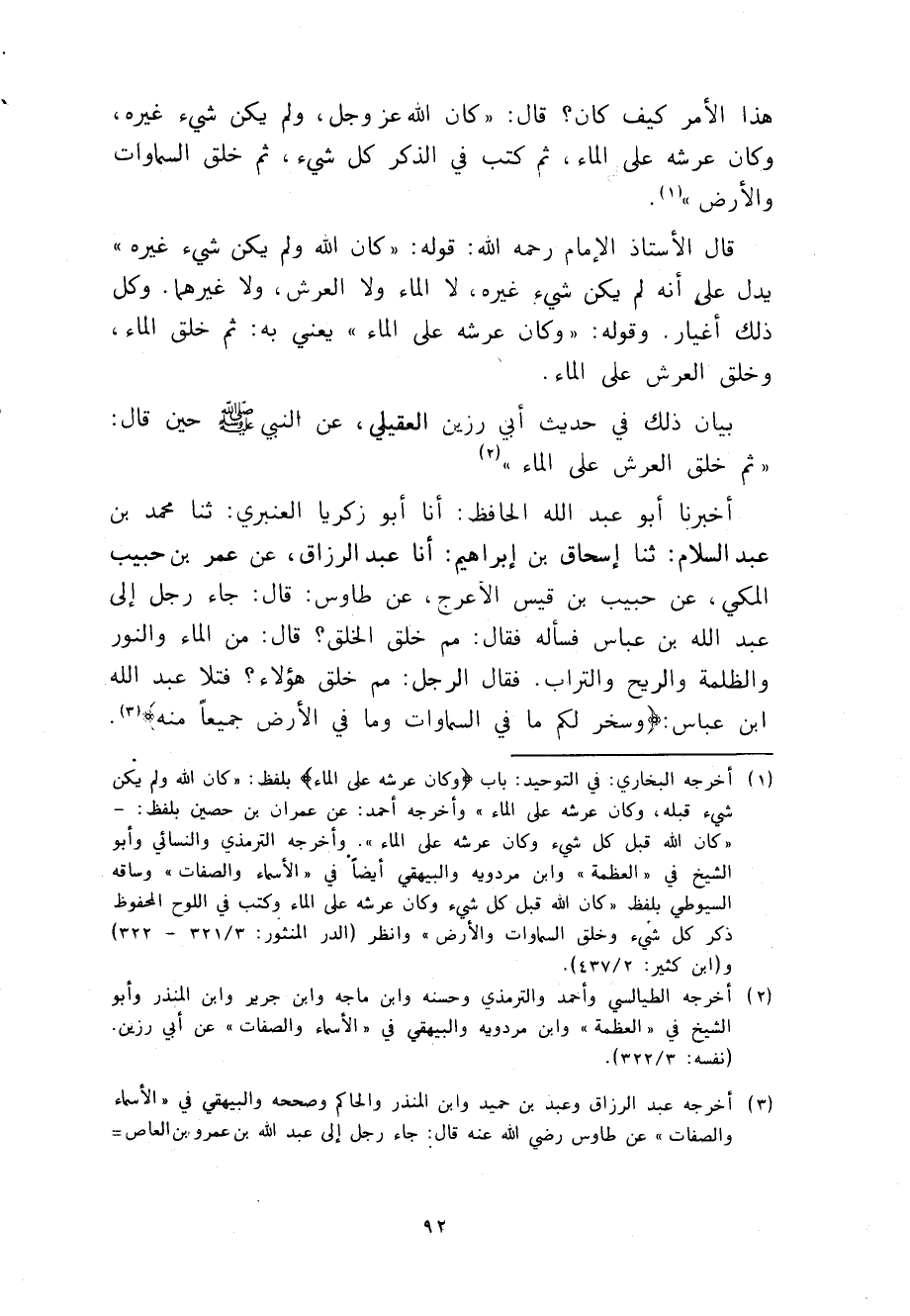 -[93]- قَالَ: فَأَخْبَرَنَا ابْنُ عَبَّاسٍ أَنَّ الْمَاءَ وَالنُّورَ وَالظُّلْمَةَ وَالرِّيحَ وَالتُّرَابَ مِمَّا فِي السَّمَاوَاتِ وَمَا فِي الْأَرْضِ. وَقَدْ أَخْبَرَ اللَّهُ عَزَّ وَجَلَّ أَنَّ مَصْدرَ الْجَمِيعِ مِنْهُ، أَيْ مِنْ خَلْقِهِ وَإِبْدَاعِهِ وَاخْتِرَاعِهِ، فَهُوَ خَالِقُ كُلِّ شَيْءٍ، خَلَقَ الْمَاءَ أَوَّلًا، أَوِ الْمَاءَ وَمَا شَاءَ مِنْ خَلْقِهِ لَا عَنْ أَصْلٍ وَلَا عَلَى مِثَالٍ سَبَقَ، ثُمَّ جَعَلَهُ أَصْلًا لِمَا خَلَقَ بَعْدَهُ، فَهُوَ الْمُبْدِعُ وَهُوَ الْبَارِي لَا إِلَهَ غَيْرُهُ، وَلَا خَالِقَ سِوَاهُ