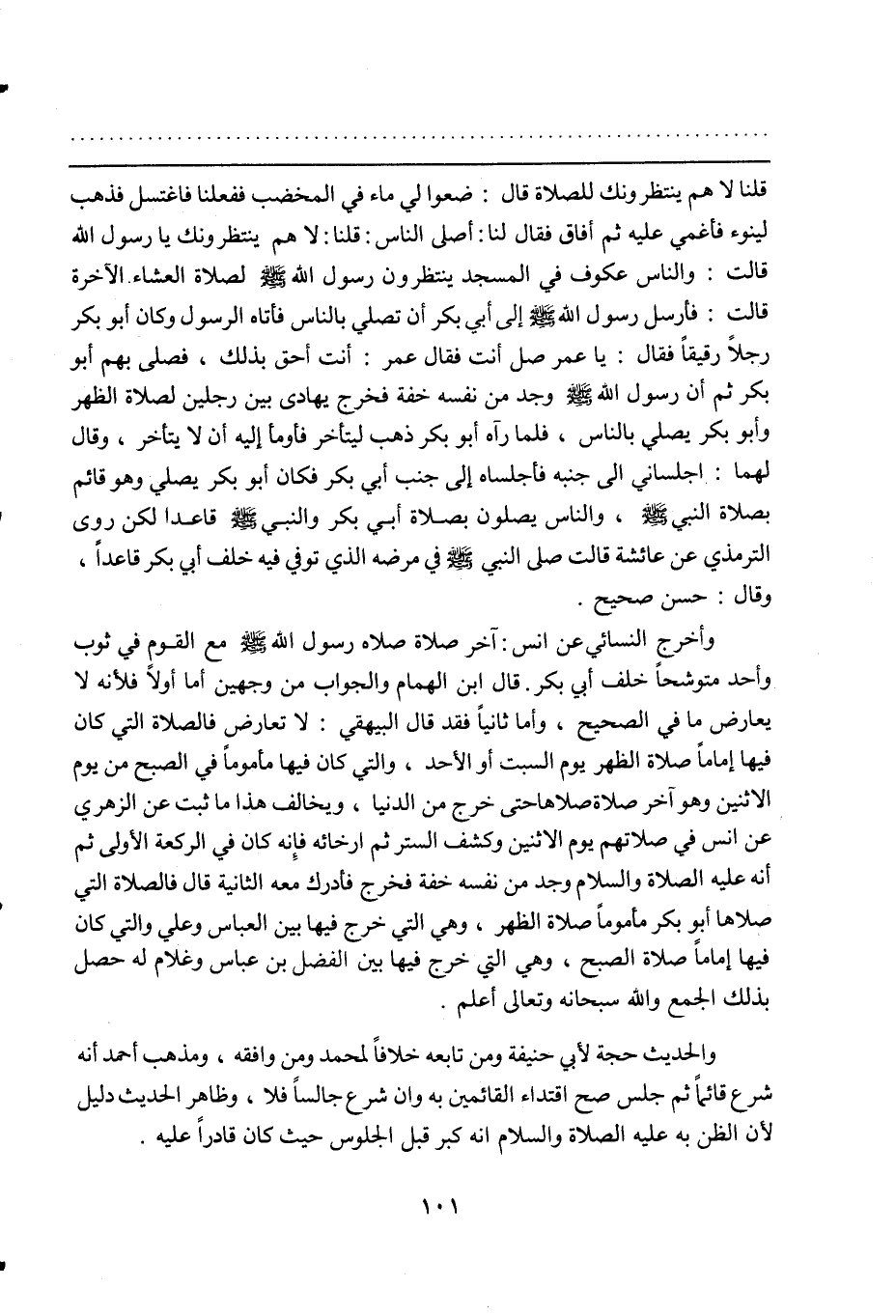 قلنا لا هم ينتظرونك للصلاة قال: ضعوا لي ماء في المخضب ففعلنا فاغتسل فذهب لينوء فأغمي عليه ثم أفاق فقال لنا أصلى الناس: قلنا: لا هم ينتظرونك يا رسول الله قالت: والناس عكوف في المسجد ينتظرون رسول الله صلى الله عليه وسلم لصلاة العشاء الآخرة قالت: فأرسل رسول الله صلى الله عليه وسلم إلى أبي بكر أن تصلي بالناس فأتاه الرسول وكان أبو بكر رجلاً رقيقاً فقال: يا عمر صل أنت فقال عمر أنت أحق بذلك، فصلى بهم أبو بكر ثم إن رسول الله صلى الله عليه وسلم وجد من نفسه خفة فخرج يهادى بين رجلين لصلاة الظهر وأبو بكر يصلي بالناس، فلما رآه أبو بكر ذهب ليتأخر فأومأ إليه أن لا يتأخر، وقال لهما: أجلساني إلى جنبه فأجلساه إلى جنب أبي بكر فكان أبو بكر يصلي وهو قائم بصلاة النبي صلى الله عليه وسلم، والناس يصلون بصلاة أبي بكر والنبي صلى الله عليه وسلم قاعداً لكن روى الترمذي عن عائشة قالت صلى النبي صلى الله عليه وسلم في مرضه الذي توفى فيه خلف أبي بكر قاعداً، وقال: حسن صحيح.