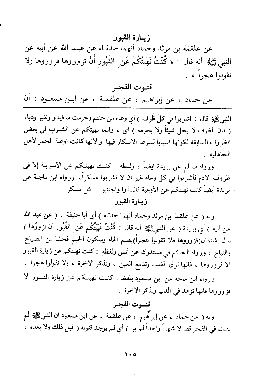 وبه (عن علقمة بن مرثد وحماد أنهما حدثاه) أي أبا حنيفة، (عن عبد الله عن أبيه) أي بريدة (عن النبي صلى الله عليه وسلم أنه قال: كُنْتُ نَهَيْتُكُم عَنِ القُبُور أن تزورُها) بدل اشتمال (فزوروها فلا تقولوا هجراً) بضم الهاء وسكون الجيم فحشاً من الصياح والنياح، ورواه الحاكم في مستدركه عن أنس ولفظه: كنت نهيتكم عن زيارة القبور ألا فزوروها، فإنها ترق القلب وتدمع العين، وتذكر الآخرة، ولا تقولوا هجراً.