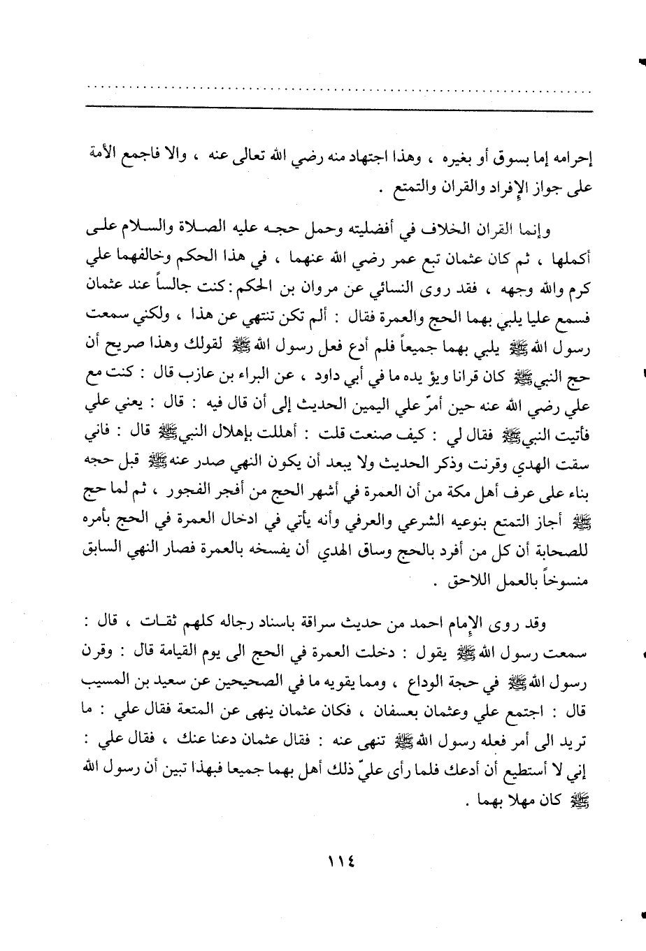 وقد روى الإمام أحمد من حديث سراقة بإسناد رجاله كلهم ثقات، قال: سمعت رسول الله صلى الله عليه وسلم يقول: دخلت العمرة في الحج إلى يوم القيامة قال: وقرن رسول الله صلى الله عليه وسلم في حجة الوداع، ومما يقويه ما في الصحيحين عن سعيد بن المسيب قال: اجتمع علي وعثمان بعسفان، فكان عثمان ينهى عن المتعة فقال علي: ما تريد إلى أمر فعله رسول الله صلى الله عليه وسلم تنهى عنه: فقال عثمان دعنا عنك، فقال علي: إني لا أستطيع أن أدعك فلما رأى عليّ ذلك أهل بهما جميعاً فبهذا تبين أن رسول الله صلى الله عليه وسلم كان مهلاً بهما.