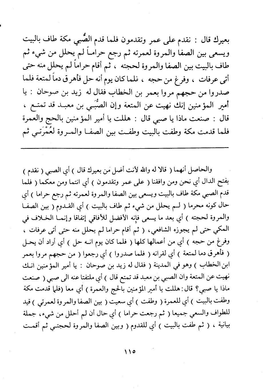 والحاصل أنهما (قالا له والله لأنت أضل من بعيرك قال) أي الصبي (نقدم) بفتح الدال أي نحن ومن وافقنا (على عمر وتقدمون) أي أنتما ومن معكما (فلما قدم الصبي مكة طاف بالبيت وسعى بين الصفا والمروة لعمرته ثم رجع حراماً) أي حال كونه محرماً (لم يحلل من شيء ثم طاف بالبيت) أي القدوم (بين الصفا والمروة لحجته) أي بعد ما يسعى فإنه الأفضل للأفاقي اتفاقاً وإنما الخلاف في المكي حتى لم يجوزه الشافعي، (ثم أقام حراماً لم يحلل منه حتى أتى عرفات، وفرغ من حجه) أي من أعمالها كلها (فلما كان يوم أنه حل) أي أراد أن يحل (فأهرق دماً لمتعة) أي لقرانه (فلما صدروا) أي رجعوا (من حجهم مروا بعمر بن الخطاب) وهو في المدينة (فقال له زيد بن صوحان: يا أمير المؤمنين إنك نهيت عن المتعة وإن الصبي بن معبد قد تمتع قال) أي ملتفتاً عنه إلى صبي (صنعت ماذا يا صبي؟ قال: هللت يا أمير المؤمنين بالحج والعمرة) أي معاً (فلما قدمت مكة وطفت بالبيت) أي للعمرة (وطفت) أي سعيت (بين الصفا والمروة لعمرتي) قيد للطواف والسعي جميعاً (ثم رجعت حراماً) أي حال أن لم أحلل من شيء، جملة بيانية، (ثم طفت بالبيت) أي للقدوم (وبين الصفا والمروة لحجتي ثم أقمت