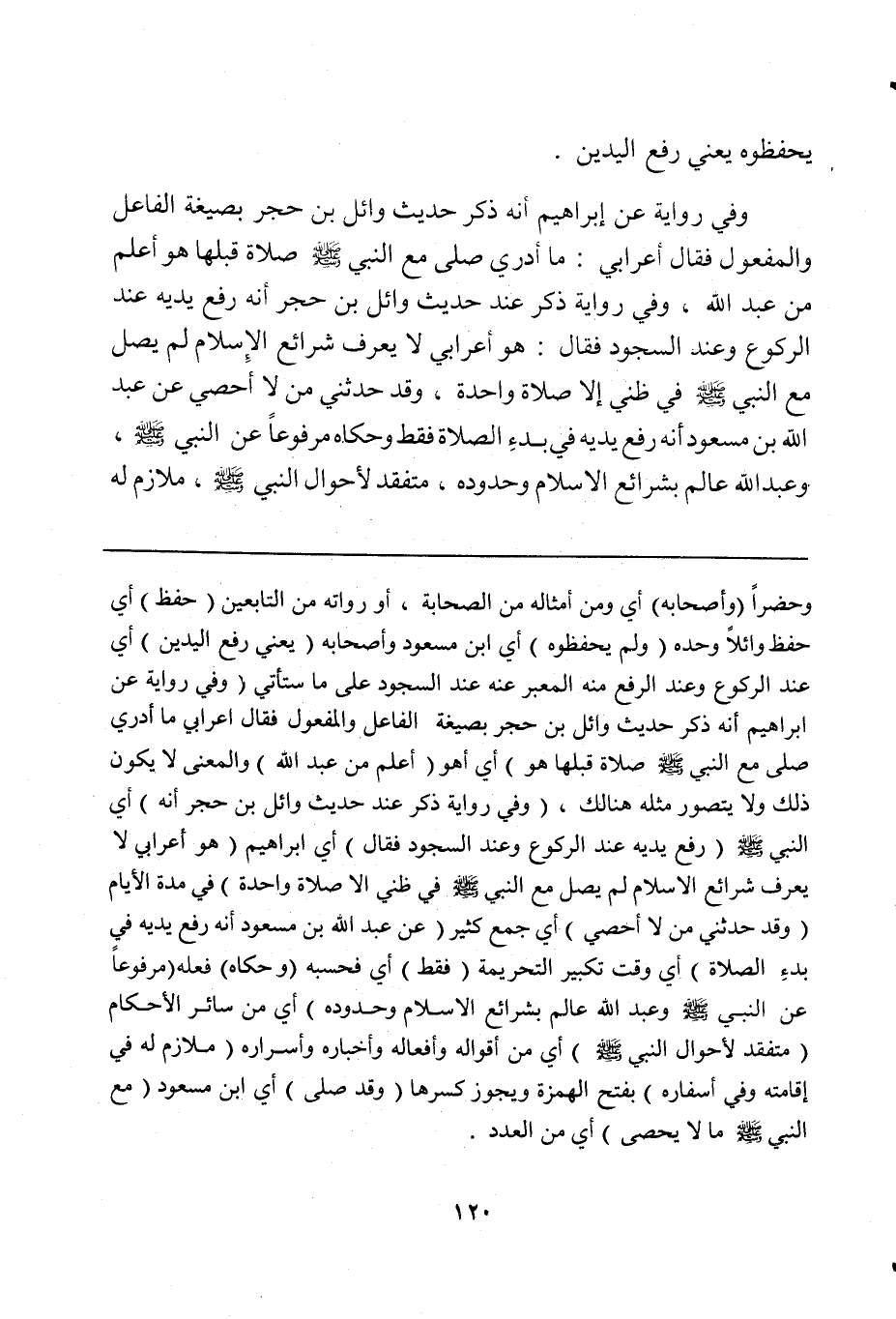 وحضراً (وأصحابه) أي ومن أمثاله من الصحابة، أو رواته من التابعين (حفظ) أي حفظ وائلاً وحده (ولم يحفظوه) أي ابن مسعود وأصحابه (يعني رفع اليدين) أي عند الركوع وعند الرفع منه المعبر عنه عند السجود على ما سنأتي (وفي رواية عن إبراهيم أنه ذكر حديث وائل بن حجر بصيغة الفاعل والمفعول فقال أعرابي ما أدري صلى مع النبي صلى الله عليه وسلم صلاة قبلها هو) أي أهو (أعلم من عبد الله) والمعنى لا يكون ذلك ولا يتصور مثله هنالك، (وفي رواية ذكر عند حديث وائل بن حجر أنه) أي النبي صلى الله عليه وسلم (رفع يديه عند الركوع وعند السجود فقال) أي إبراهيم (هو أعرابي لا يعرف شرائع الإسلام لم يصل مع النبي صلى الله عليه وسلم في ظني إلا صلاة واحدة) في مدة الأيام (وقد حدثني من لا أحصي) أي جمع كثير (عن عبد الله بن مسعود أنه رفع يديه في بدءِ الصلاة) أي وقت تكبير التحريمة (فقط) أي فحسبه (وحكاه) فعله (مرفوعاً عن النبي صلى الله عليه وسلم وعبد الله عالم بشرائع الإسلام وحدوده) أي من سائر الأحكام (متفقد لأحوال النبي صلى الله عليه وسلم) أي من أقواله وأفعاله وأخباره وأسراره (ملازم له في إقامته وفي أسفاره) بفتح الهمزة ويجوز كسرها (وقد صلى) أي ابن مسعود (مع النبي صلى الله عليه وسلم ما لا يحصى) أي من العدد.
