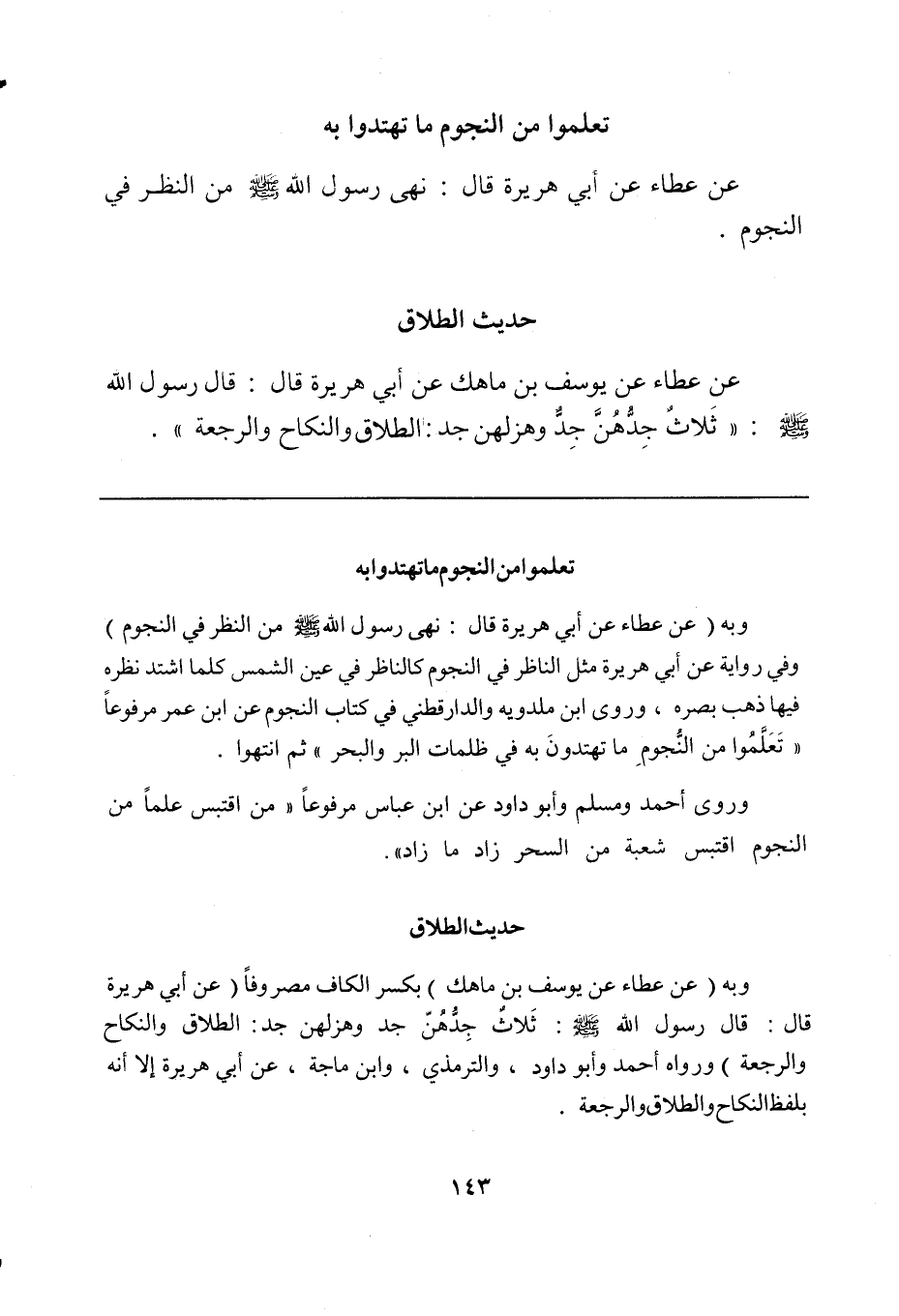وبه (عن عطاء عن أبي هريرة قال: نهى رسول الله صلى الله عليه وسلم من النظر في النجوم) وفي رواية عن أبي هريرة مثل الناظر في النجوم كالناظر في عين الشمس كلما اشتد نظره فيها ذهب بصره، وروى ابن ملدويه والدارقطني في كتاب النجوم عن ابن عمر مرفوعاً "تَعَلَّمُوا من النُّجومِ ما تهتدونَ به في ظلمات البر والبحر" ثم انتهوا.